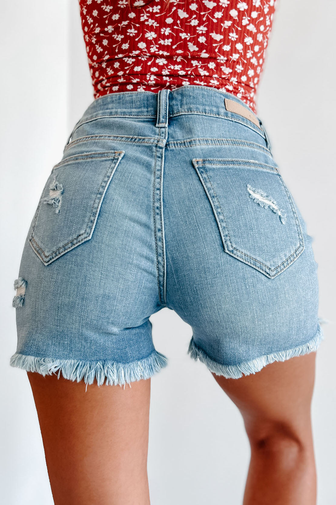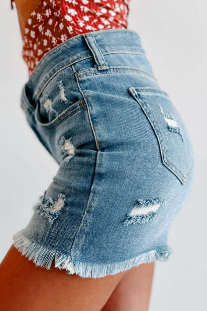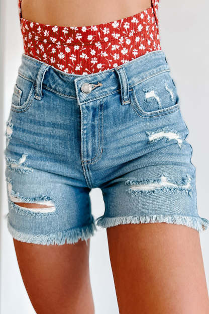 Lina High Rise Frayed Hem Distressed Cello Shorts (Medium Denim)