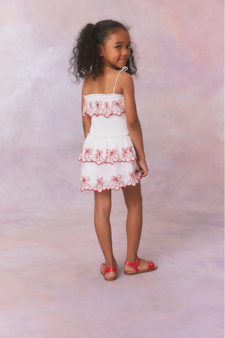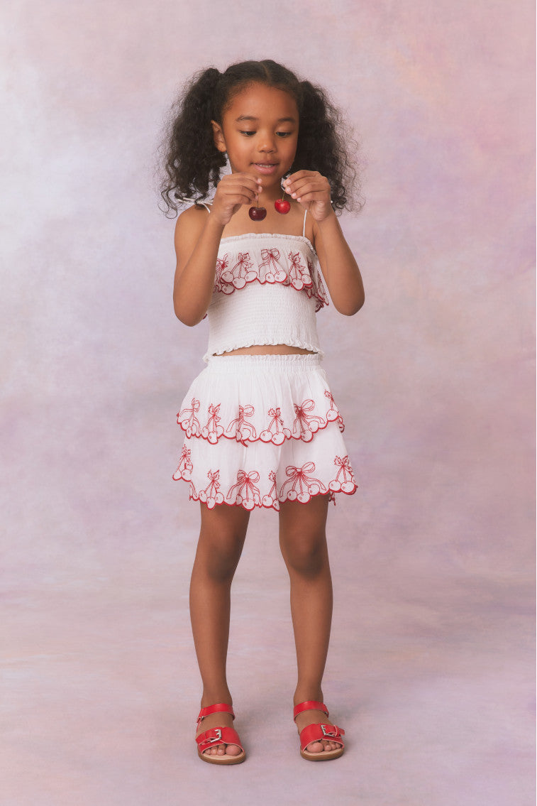 Our best-selling Ruffle Mini Skirt returns for our little loves with an airy cotton fabric and sweet cherry embroideries as a scallop detail. The elasticated waistband and double lining offers flexibility in comfort and styling.