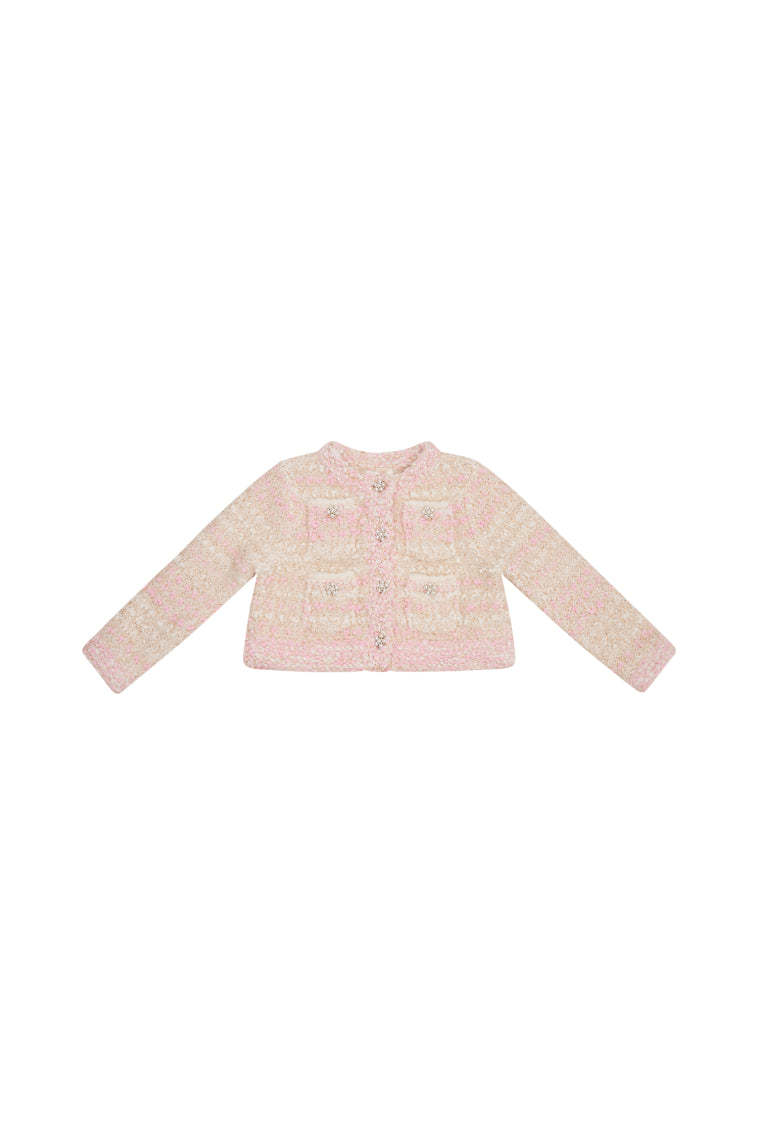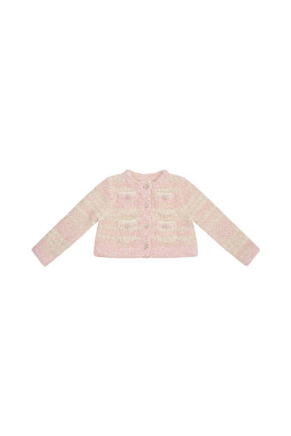 Loving on the Loki Cardigan. Made to match our Blanca Cardigan. this layer for our littles features a sequin yarn mixed with a boule yarn creating a stunning dynamic dimensional texture. This cute piece features pockets and buttons down center front. Pair with the Bryce Skirt for a full set.