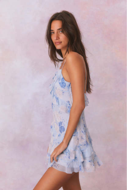 Introducing the Lomina Dress. The mini version of our best-selling Rialto. this flirty dress debuts in our signature fragrance prints. With a chiffon fabric. this dress features thin spaghetti straps and overlapping. asymmetrical ruffles at the neckline that descend through the slightly fitted skirt. Match your favorite scent to your look with this must-have mini.