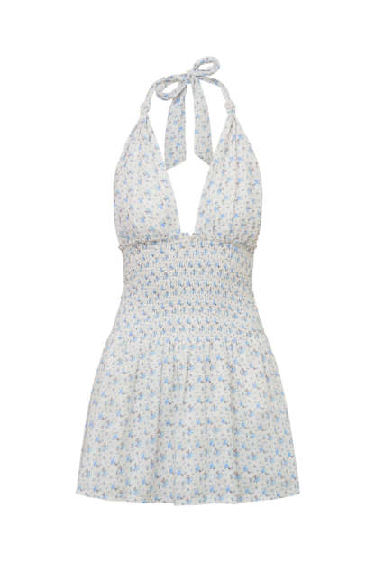 The Luisetta Dress returns as part of our Upcycled Icons Collection. a limited-edition. sustainable capsule featuring our best-selling silhouettes made from remnant OhMollys fabrics. The pretty mini features a halter top with knotting details on the straps. a deep v-neckline. a smocked bodice. and a slightly ruffle skirt.