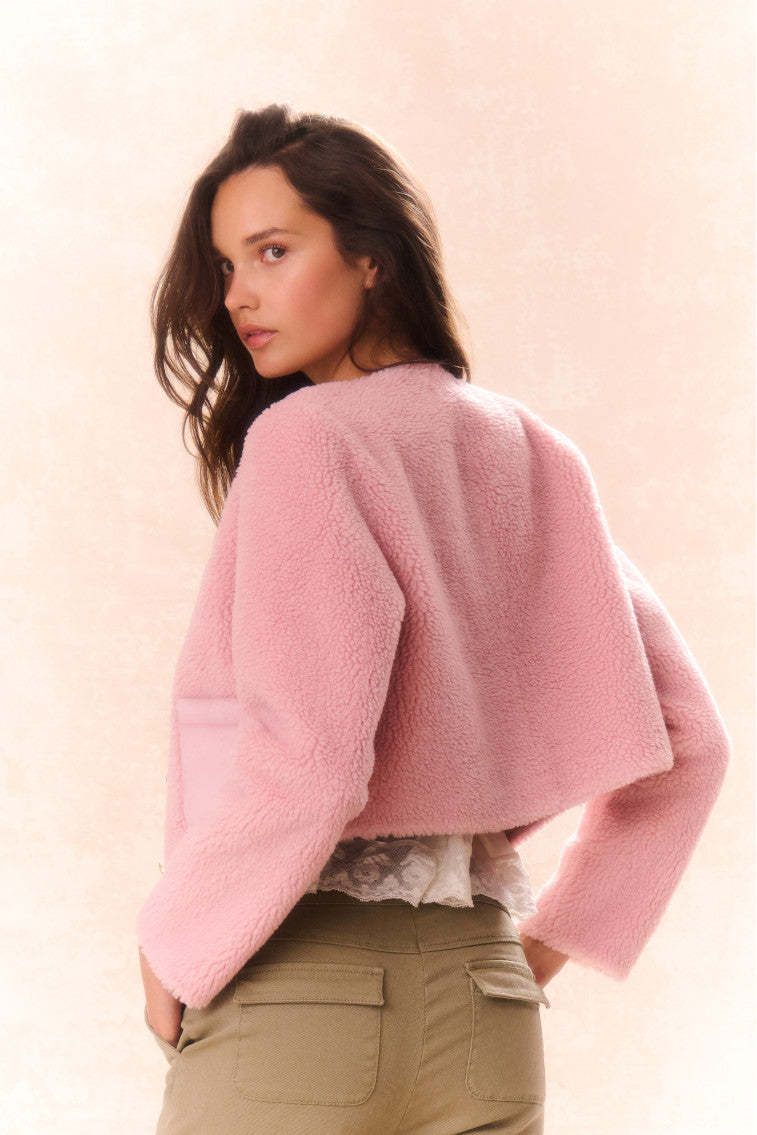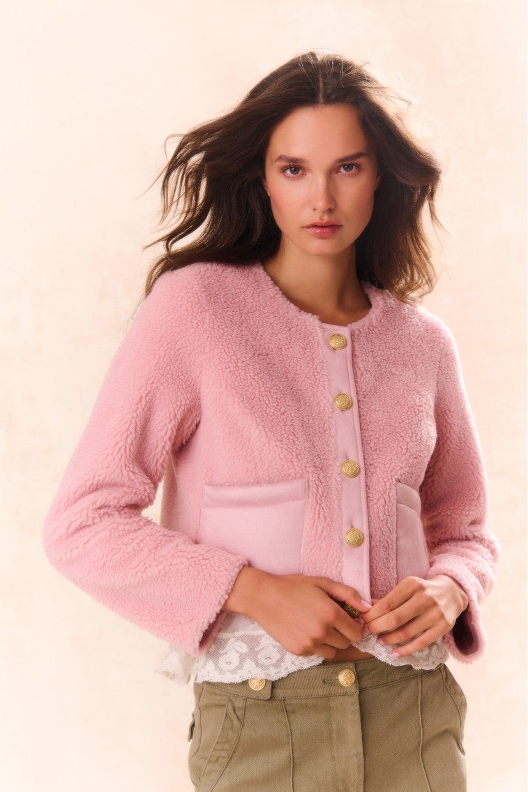 Elevate your outfit with the Lully Jacket. This luxe layer is crafted from a short hair faux shearling mixed with faux suede details for a stunning contrast. The charming jacket has an easy pull on fit. gold military buttons down center front. and patch pockets at the front.