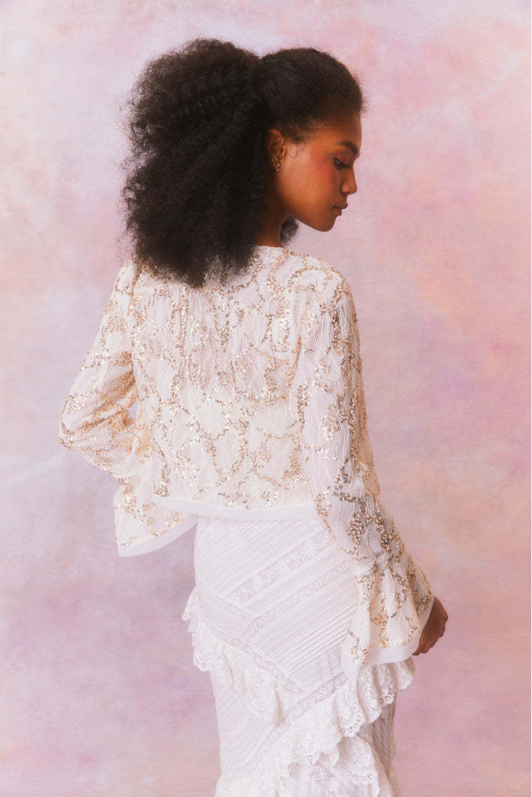 Our best-selling top has returned for the season in a new lurex chantilly lace fabric designed with metallic for a subtle shimmer detail. The vintage-inspired top features intricate lace detail all over. This piece has long bell sleeves and our custom OhMollys buttons down the center front. Pair with your favorite vintage jeans.