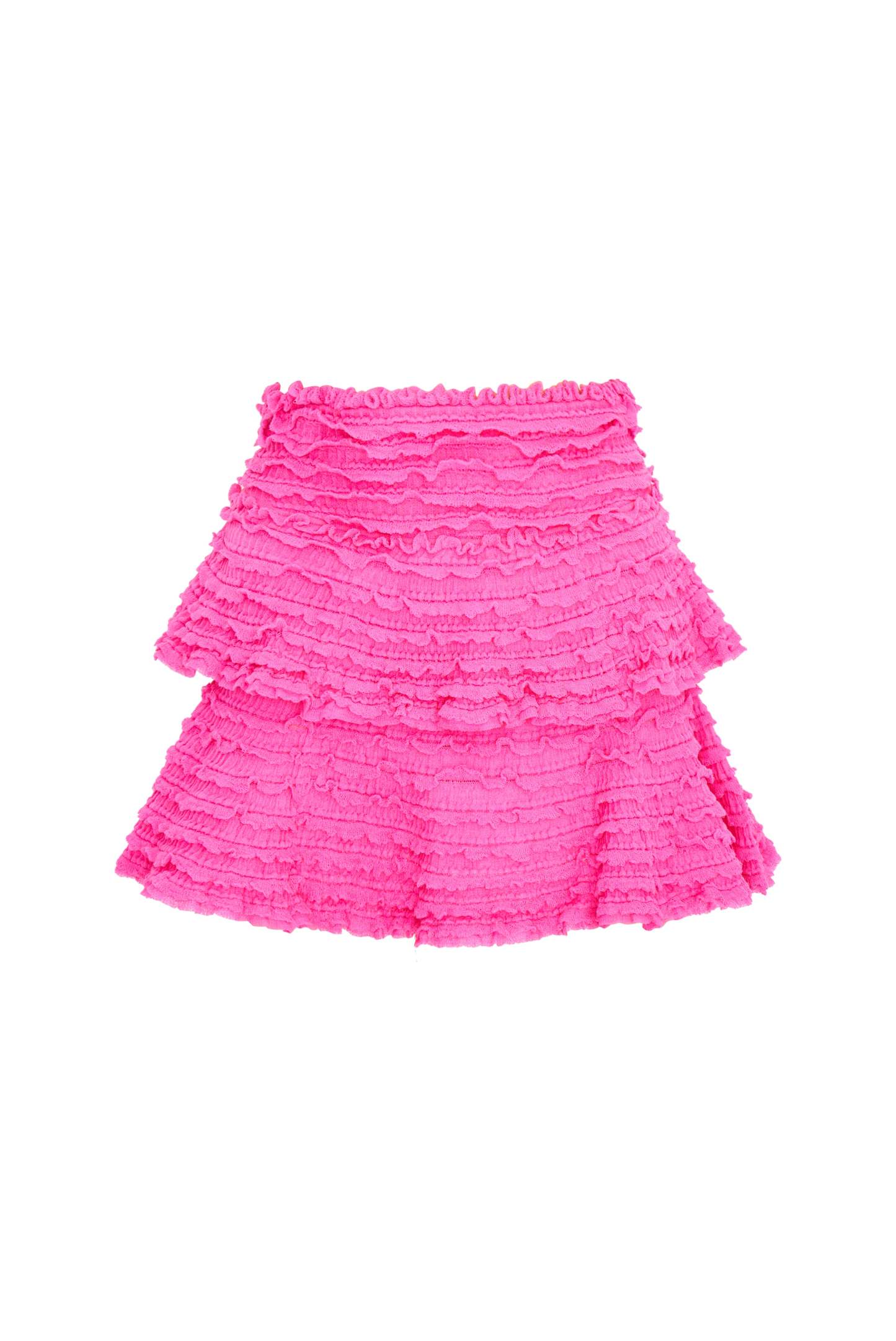 Introducing the Macaw Skirt. This flirty mini stuns with a gauzy. lightweight fabric featuring tiny ruffles all over creating a playful texture. A sister to our signature Ruffle Mini Skirt. this pretty skirt stuns with two tiers and tiny ruffle details throughout the yoke. Pair with our Azami Top or Celosia Cardigan for a full look.