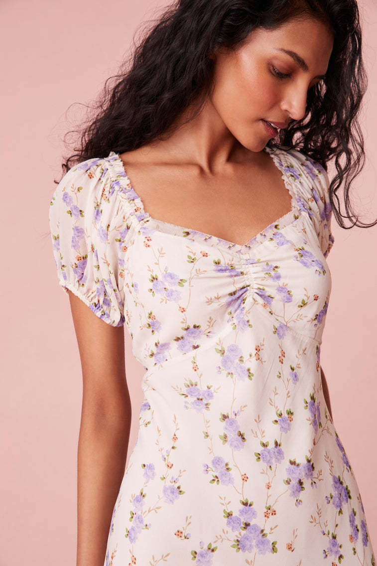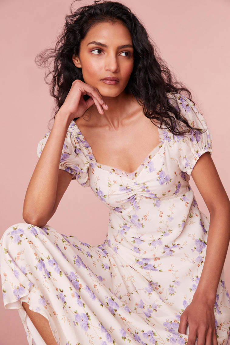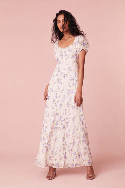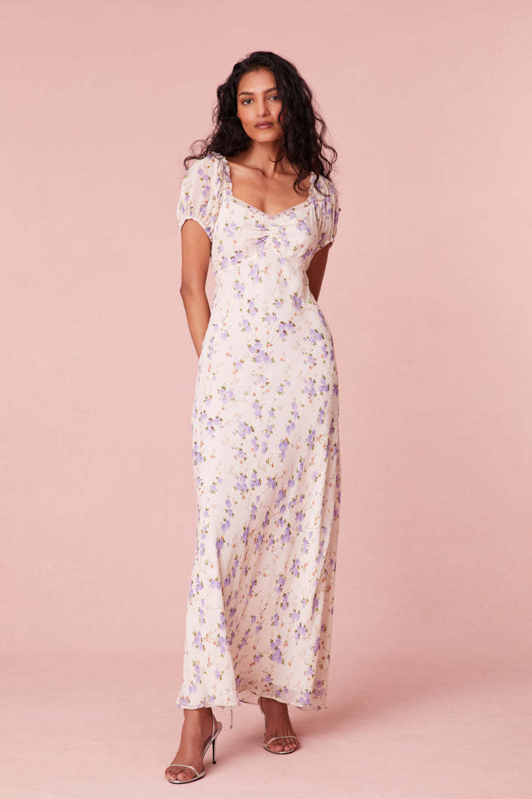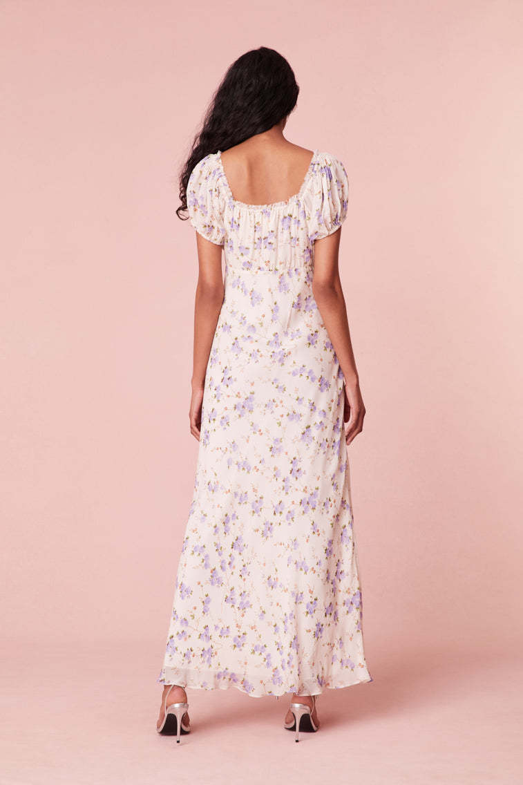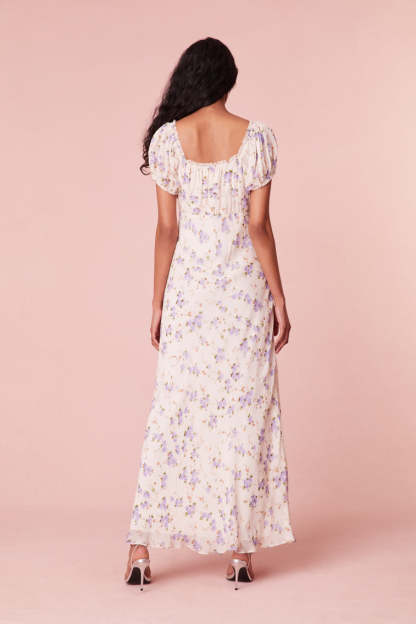 Introducing the Madara Dress. This timeless maxi debuts with a printed chiffon fabric featuring vintage-inspired florals. With an easy and flattering silhouette. the dress features short puff sleeves with elastication for comfort. a slightly square neckline with ruching at center front that descends to a breezy maxi skirt.