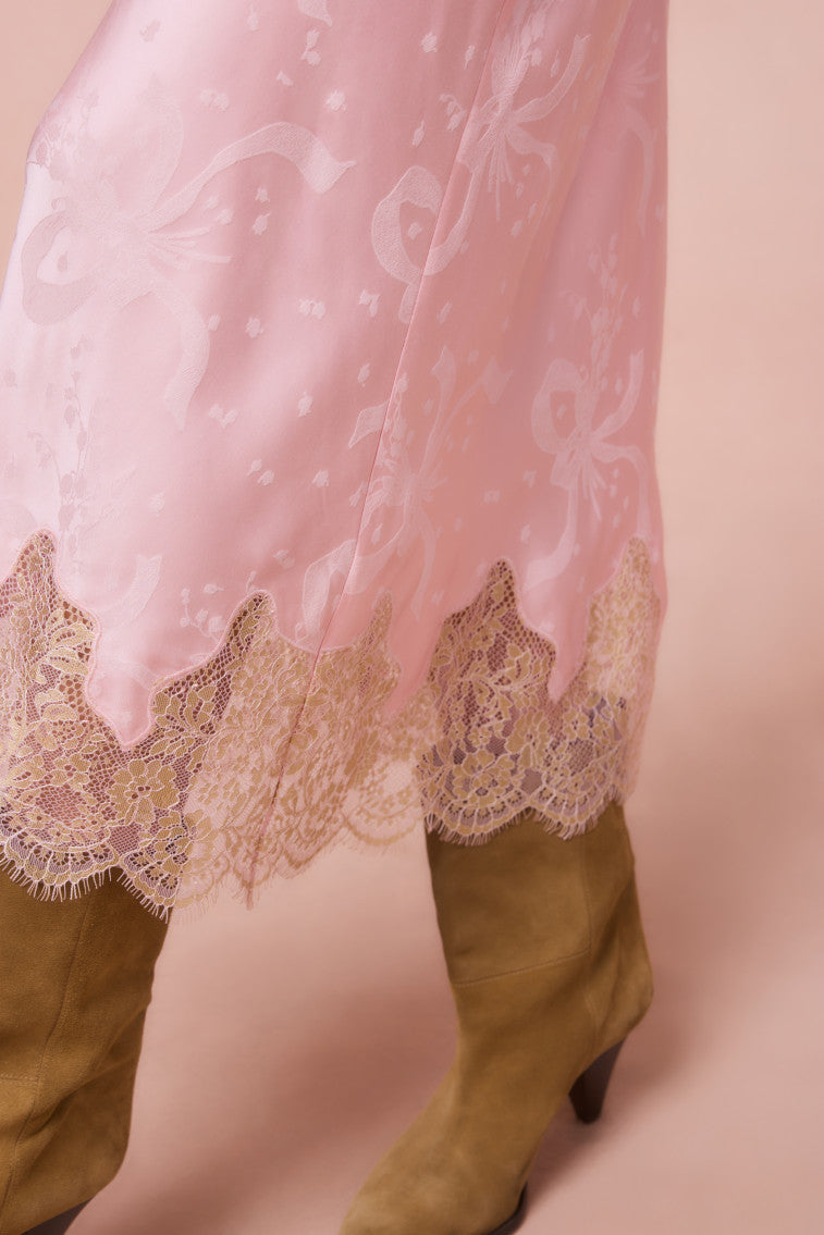 Slip into romance with the Malina Skirt. This gorgeous. feminine slip is soft-to-the-touch with a slightly heavier silk charmeuse fabric. ideal for the cold weather season. A large scattered bow jacquard adorns the bias slip before falling to scallop metallic gold lace trimming the hem.