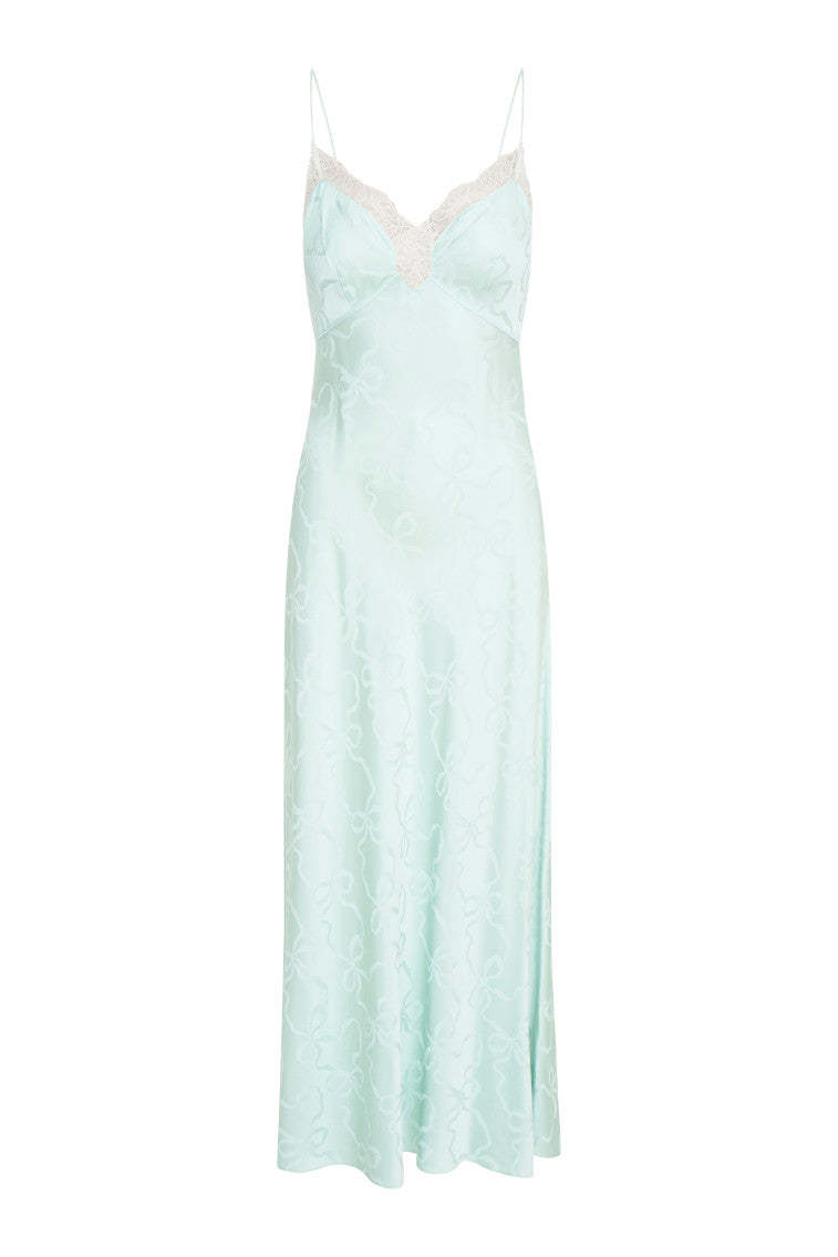 Feeling flirty in the Manuela Dress. This major midi stuns with a silky custom jacquard fabric with beautiful bow artwork woven throughout. A vintage-inspired slip dress. she's easy to wear and effortlessly chic with a bias cut. scallop lace detail at the neck. and a subtly Glamorous cup detail.