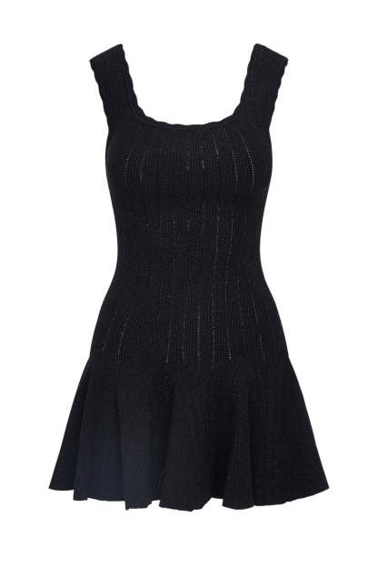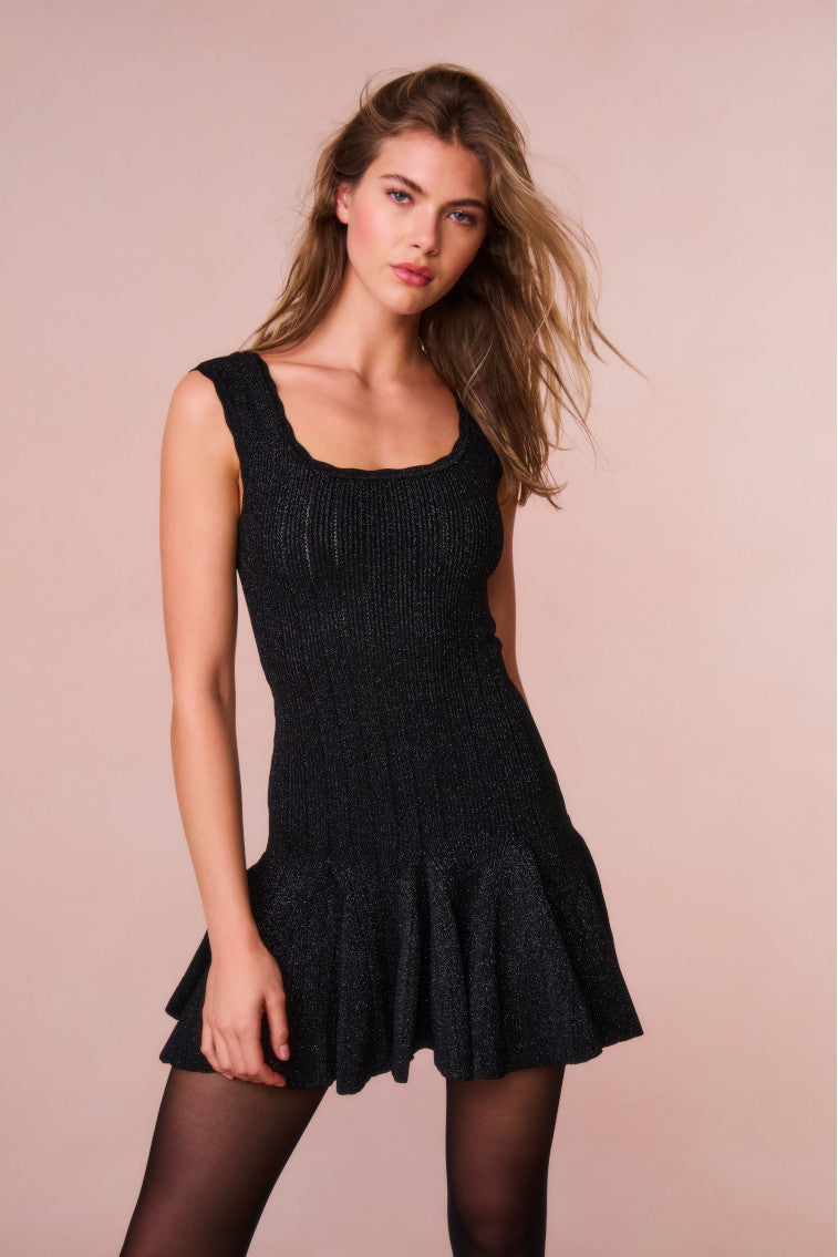 Introducing the Maryanne Dress. This fit-to-flare mini is cozy chic designed from a stretch ribbed viscose fabric featuring a shimmering lurex threading throughout. The bodycon dress stuns with scallop trim detail along the armholes and neckline while beautiful godet insets line the piece.
