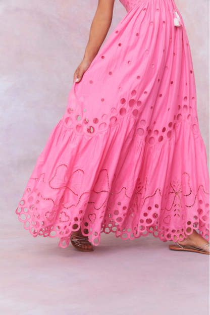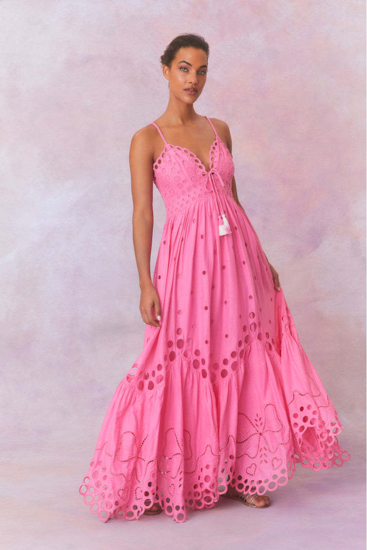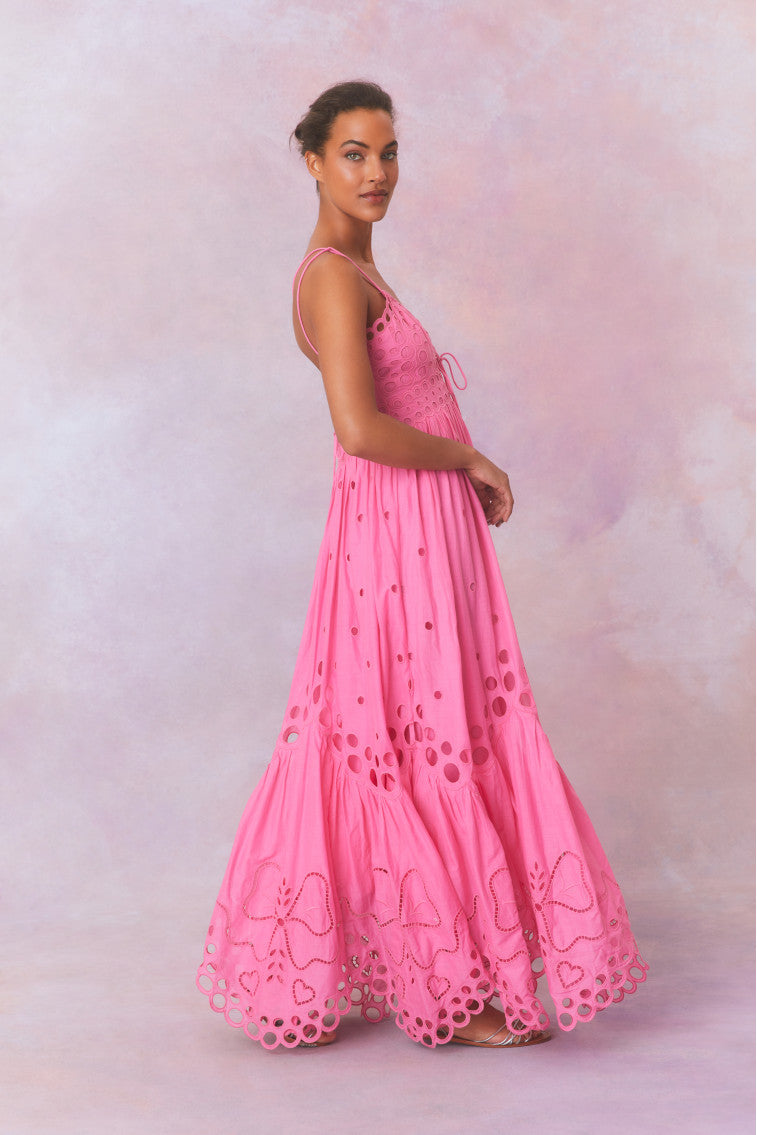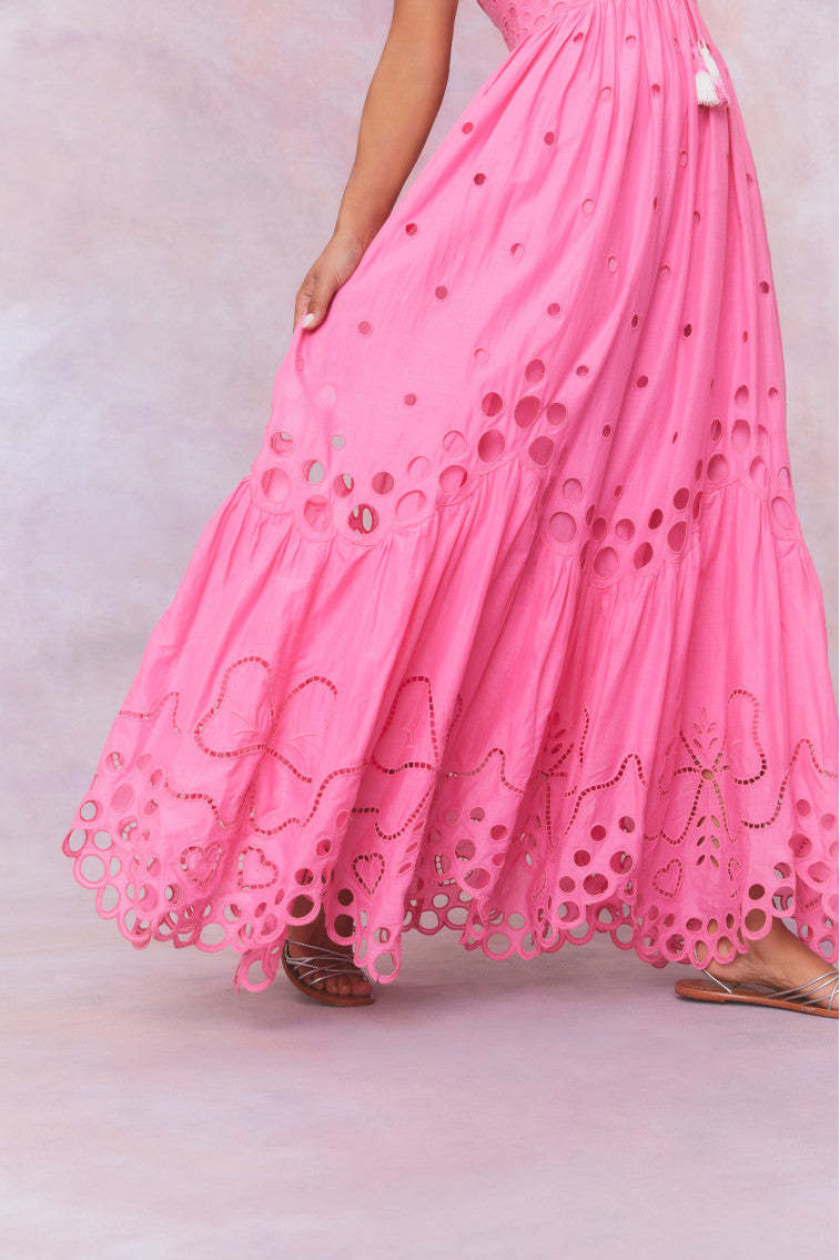 The Melville Dress stuns with a cotton. eyelet fabric. Designed for the summer season. this dreamy maxi is all about the details with intricate bow embroidery and circular eyelets all over. The dress begins with thin. spaghetti straps that criss-cross at the back. a v-neckline. circular eyelets on the bodice that descends to a sweeping skirt finished with the sweet bow embroidery.