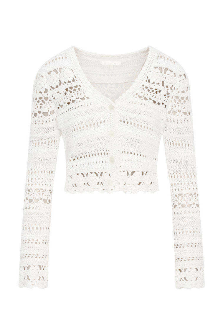 Introducing the Middleton Cardigan. Airy and easy. this gorgeous knit is designed from 100% cotton with crochet detailing all over: from mixed pointelles to insets to dimensional florals. The cropped cardigan has insets at the shoulders. the sleeves. and along the hem. The center front placket features pointelles and crochet edging. This sweater includes functional buttons at the center front. Pair with our Fosta Pants for a full set.