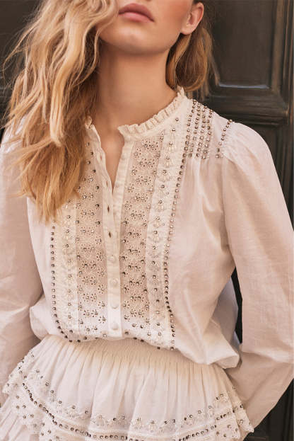 Introducing the Mildrene Top. This Victorian-inspired blouse features delicate rhinestone crystal details all over. The button-down top is designed to be a perfect length for tucking in. The long sleeves are adorned with eyelet details. each embellished with tiny rhinestones for a touch of shimmer.