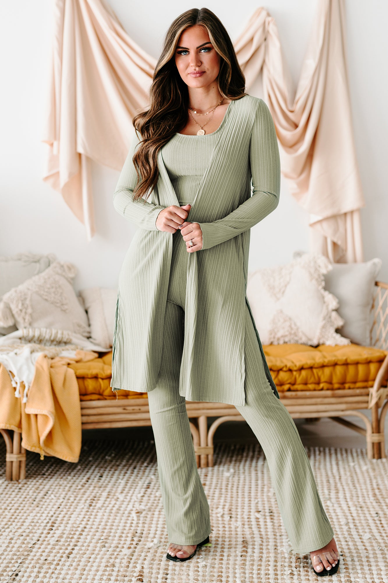 Don't Miss Out On This Super Comfortable. Sage. Ribbed Cardigan. Crop Tank. & Flared Pants. Three Piece Set!