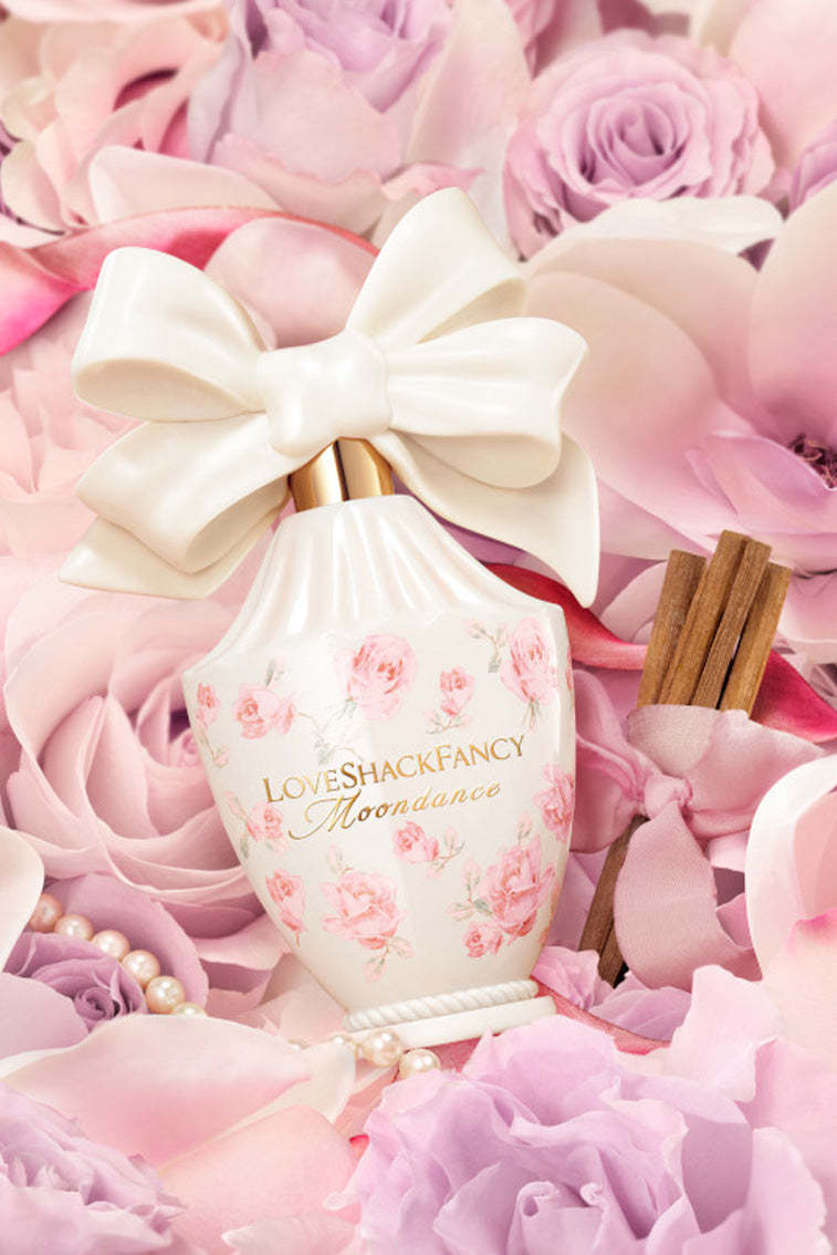 An oversized bow. perfectly imperfect. The OhMollys perfume bottle references founder Rebecca Hessel Cohen's lifelong love of ribbons with a sculptural bow top that appears tied and tightened by hand. The ivory and pink Ribbon Rosa Flora print is a signature design chosen from over 2.000 in the LoveShackFancy print and lace library to decorate the bottle itself. a softly curved antique-inspired vessel carved with scalloping on top and a ring of rope on the bottom. Once finished. its spray top is removable so the bottle can be upcycled as a bud vase.