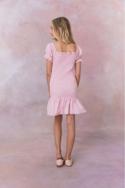 Picnic party ready in the Mosa Dress. This sunshine dress stuns with a pretty in pink gingham print. short puff sleeves. a smocked bodice. and an airy skirt.