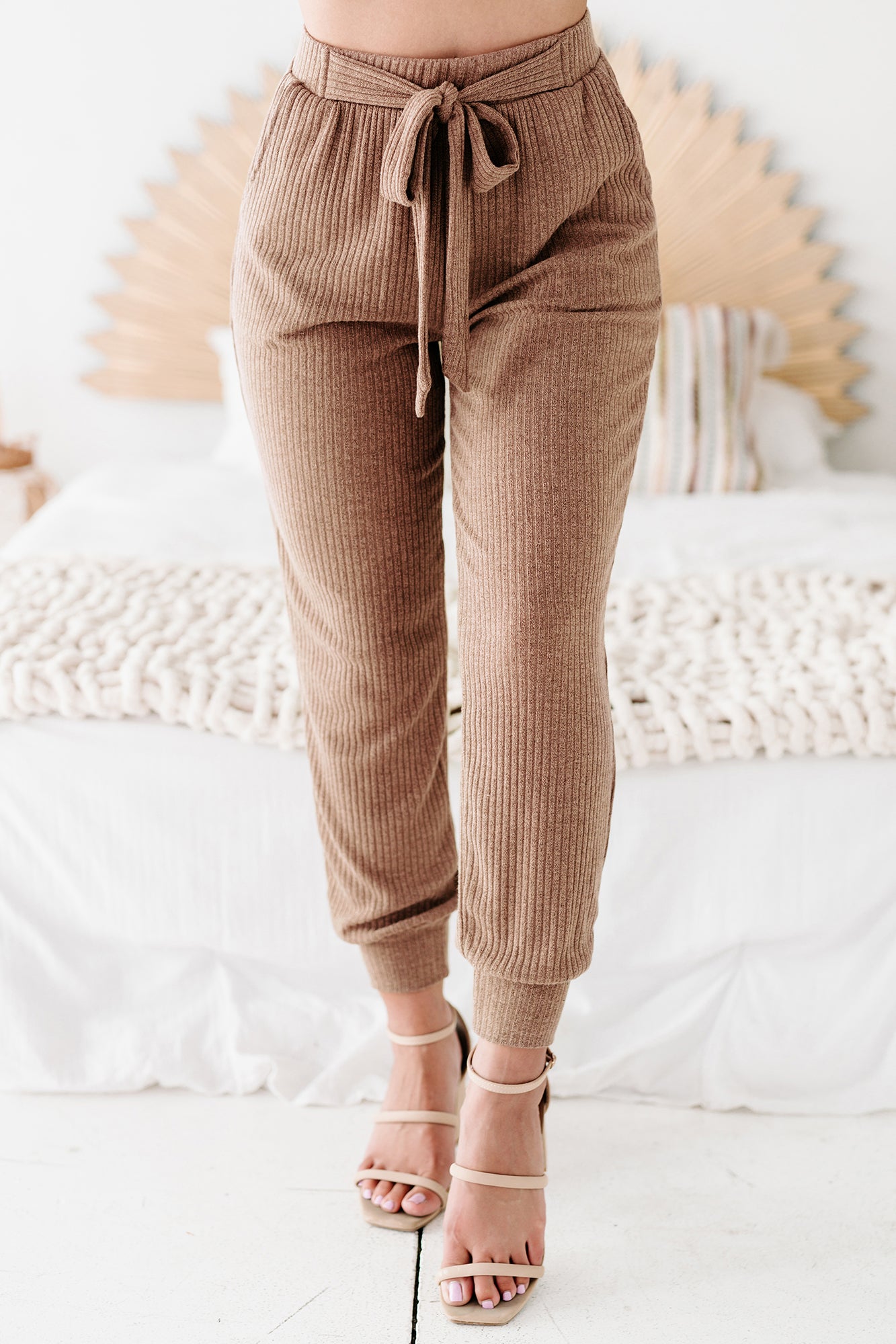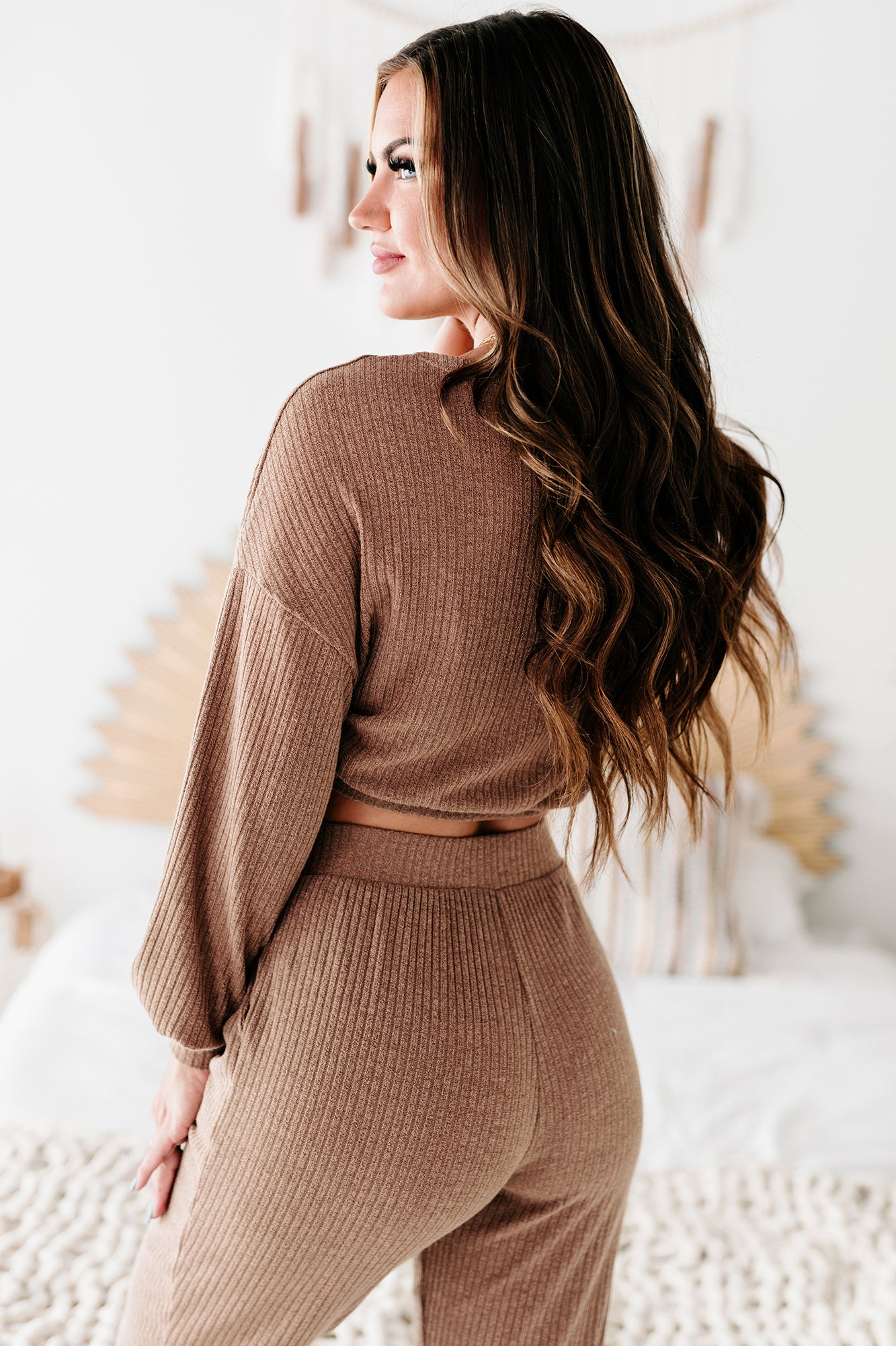 You Can Make So Many Outfits With This Mocha. Ribbed. Long Sleeve Crop Top & Tie-Waist Joggers Set!