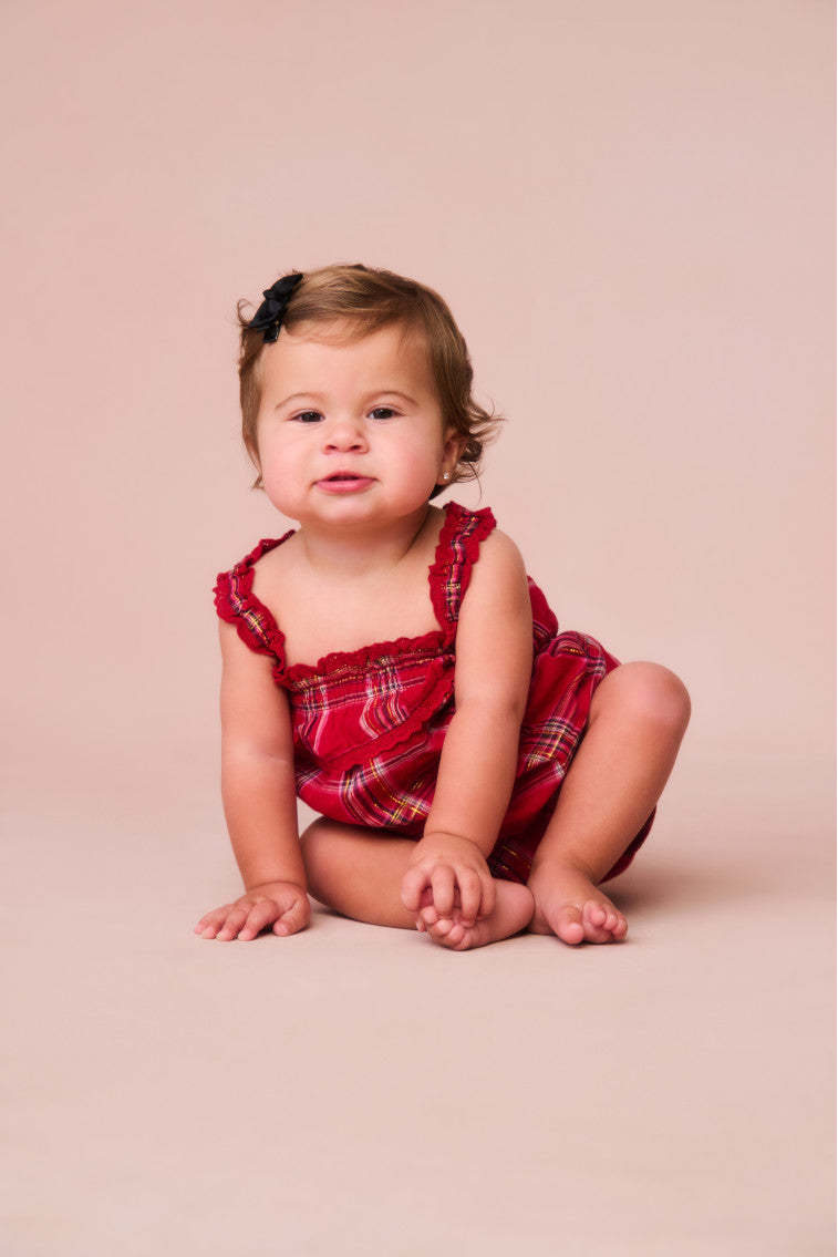 The Nadiana Pinafore returns for the holiday season with a festive tartan print. This sweet piece features easy. ruffle tank straps. charming ruffles at the neckline. and a comfortable fit.