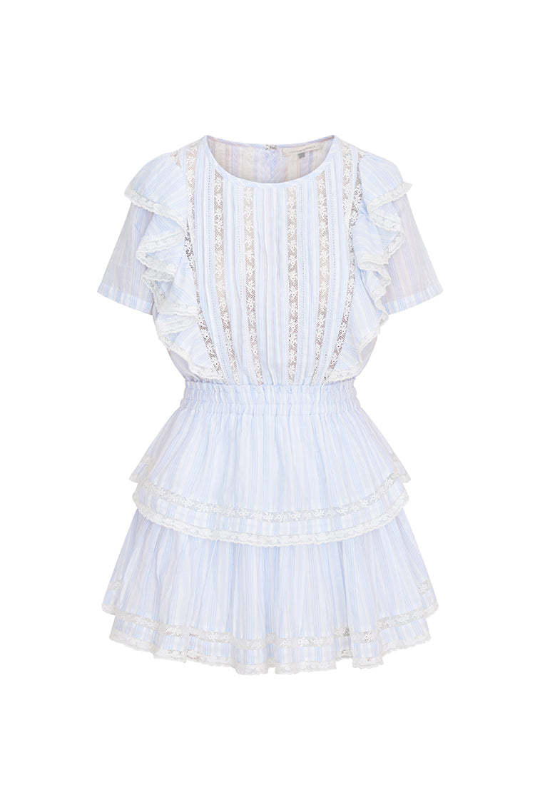 Our signature Natasha Dress returns for the season with a new summer-inspired blue-and-white striped fabric. This easy frock features double ruffled flutter sleeves. which cascade down the front and back of the body to highlight the elasticated waist. Intricate custom lace panels are inset and trim the skirt's flounces.