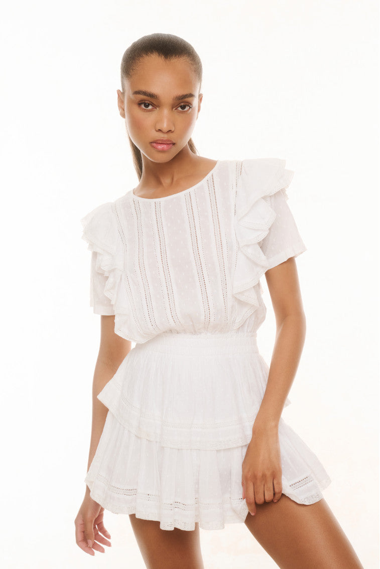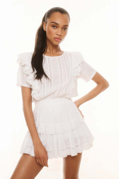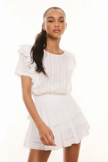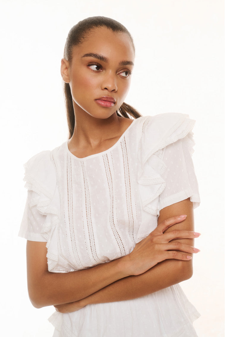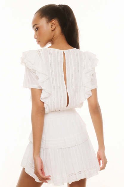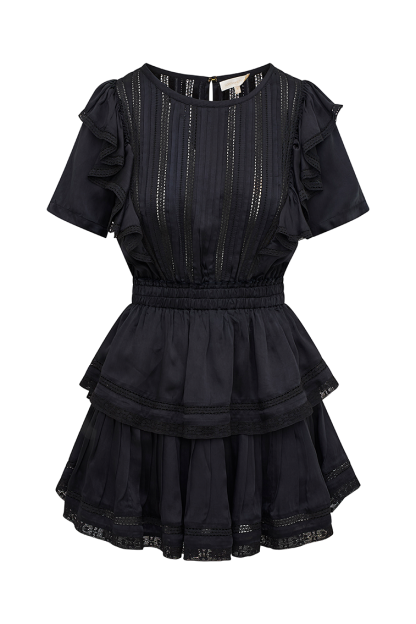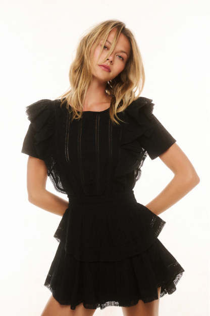 Part of our Heritage Collection the Natasha dress features double ruffled flutter sleeves which cascade down the front and back of the body to highlight the elasticated waist. Intricate inset lace trims add an air of femininity and ease.