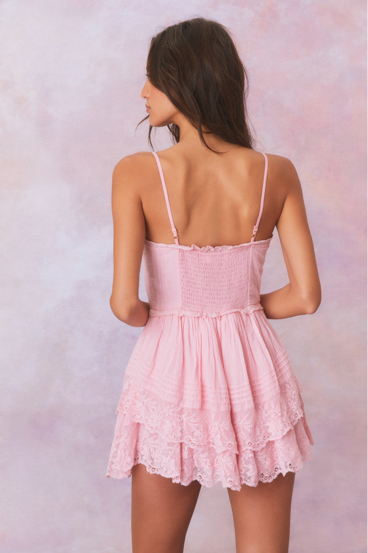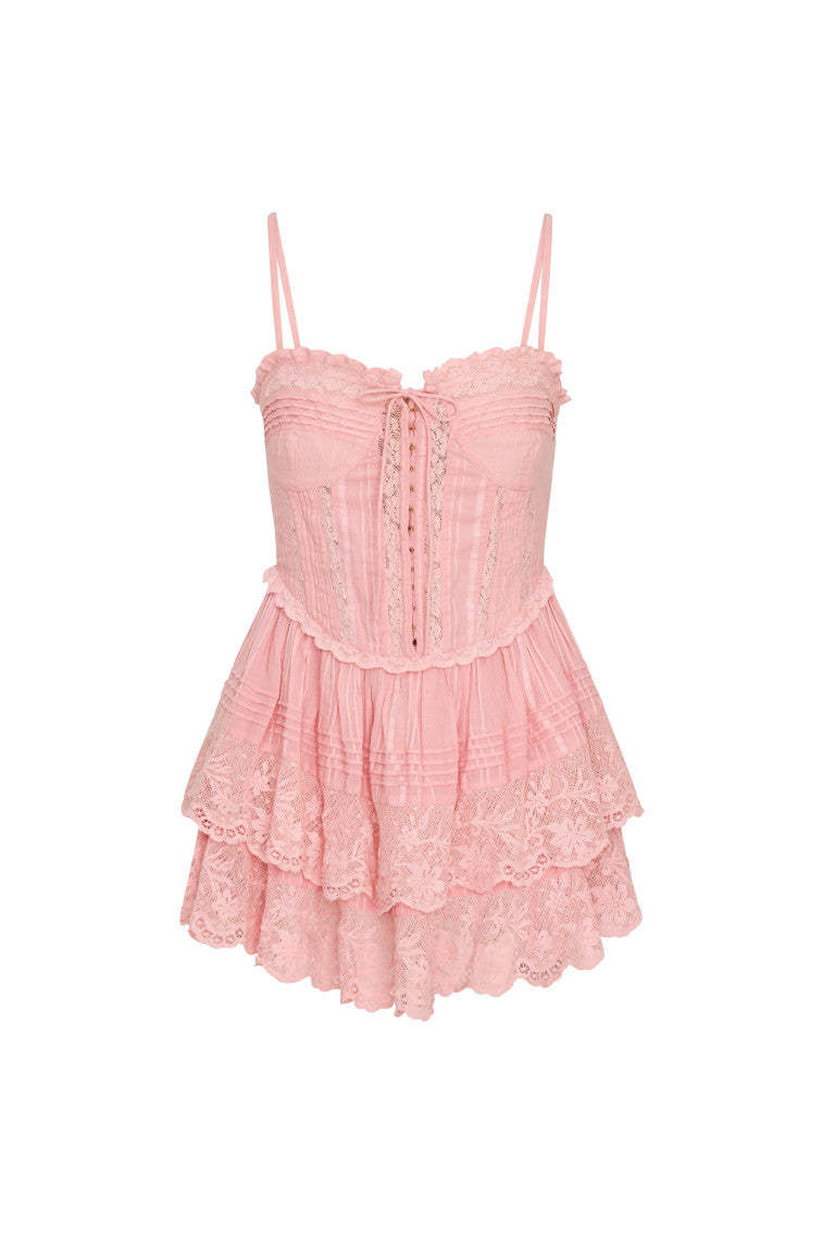 Introducing the Nerida Dress — a Victorian-inspired bustier mini dress that blends elegance with modern sophistication. This dress features bustier cups adorned with lace and delicate tucking. providing a romantic and structured silhouette. The shaped waist releases into a beautiful two-tiered skirt striped with lace details. adding texture and charm. A smocked back ensures comfort and ease of wear. while a tie at the chest and corset-inspired hook and eye neckline add vintage-inspired flair. At the center front. small hook and eye closures add a touch of refinement. while the back waist is smocked for a flattering fit. Adjustable spaghetti straps offer versatility and a customized fit. making this mini a perfect choice for various occasions.