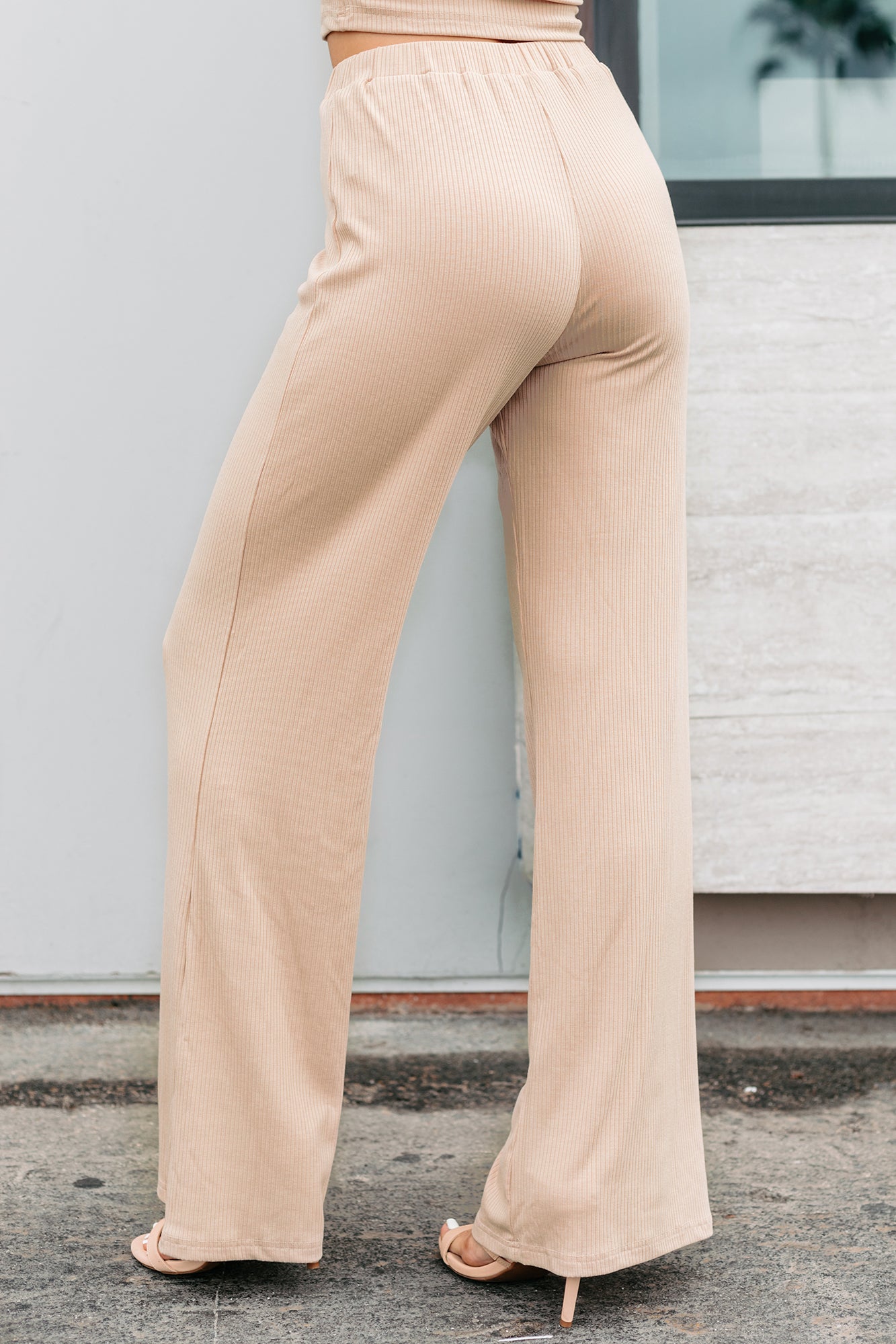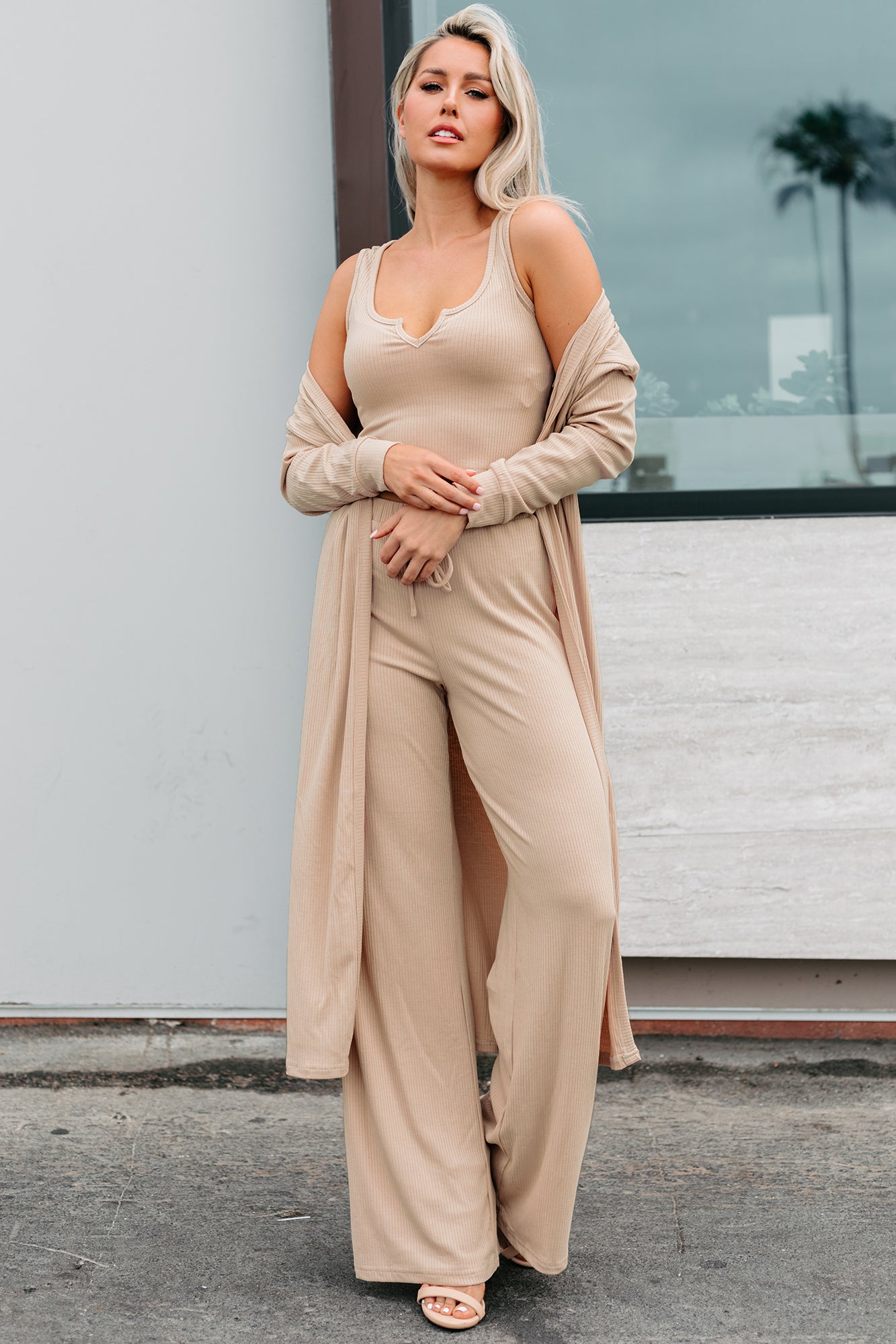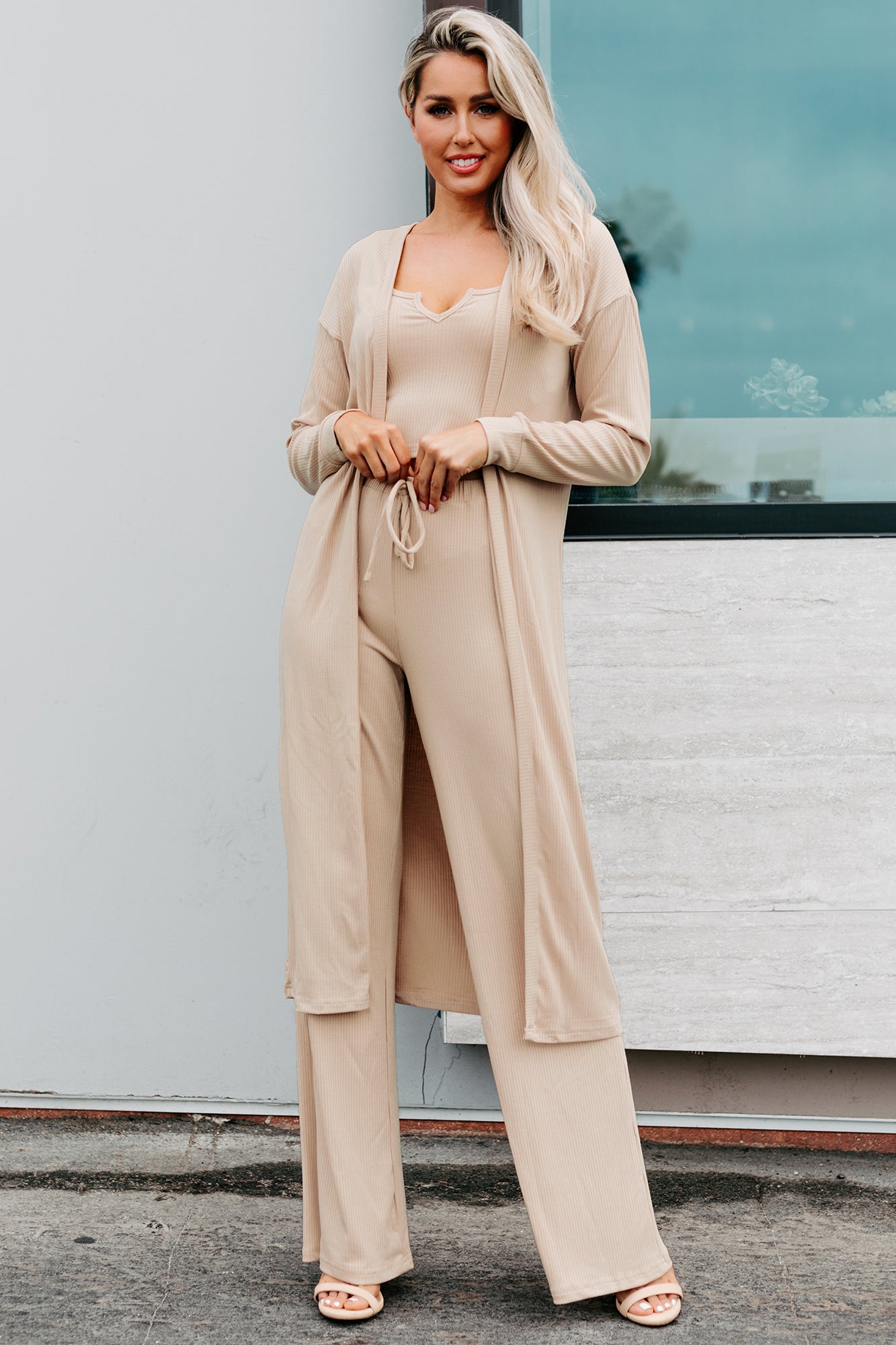 Get Excited For This mytopdress Original. Natural. Ribbed. Three-Piece Set! You Get A Crop Top. Some High Rise. Wide Leg Pants. & A Duster Cardigan!