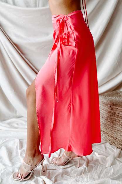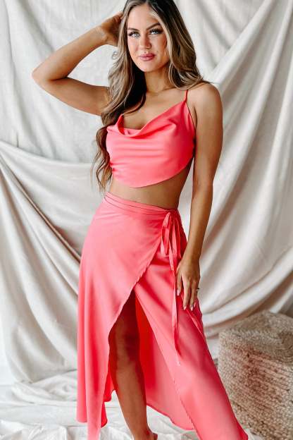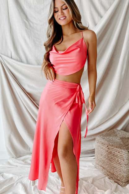 On One Condition Two-Piece Satin Skirt Set (Coral)