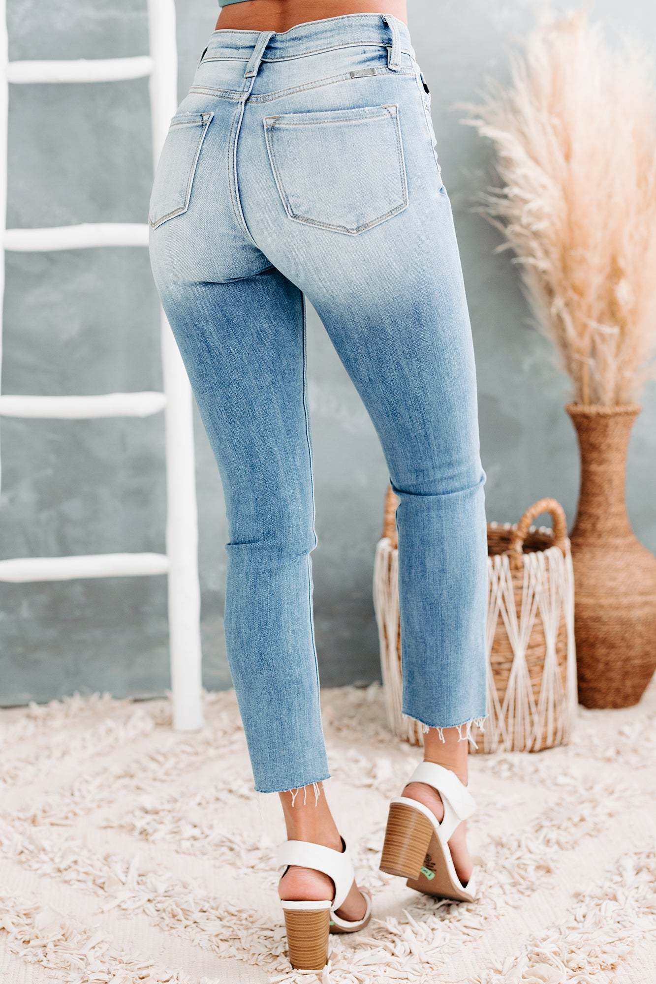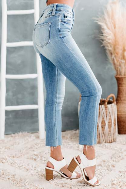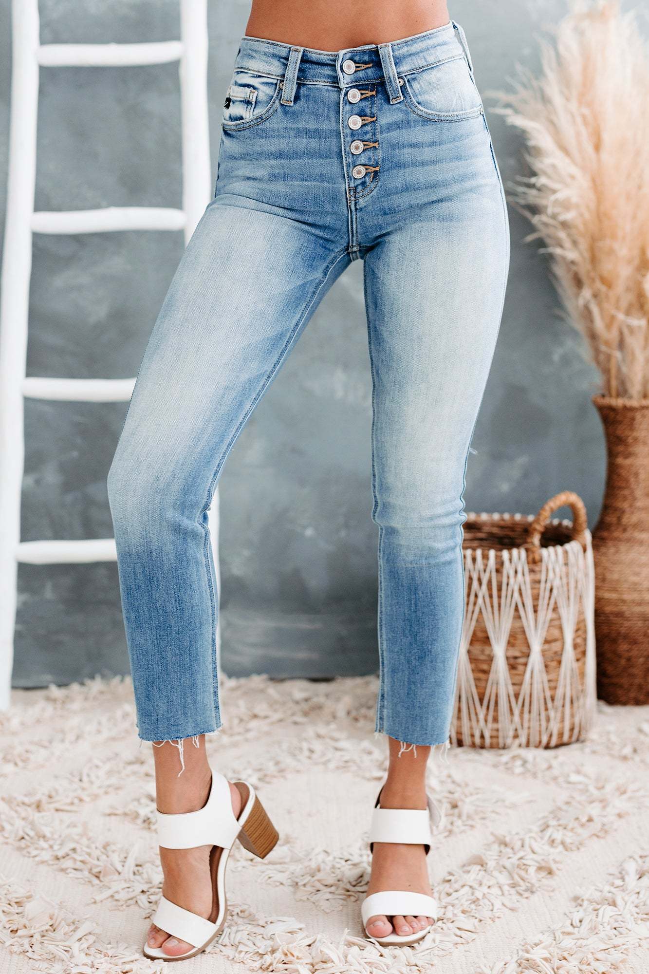 These Medium Wash Kancan Jeans Are Going To Knock Your Socks Off! They're A High Rise Style With A Button-Down Fly. & A Slim. Straight Leg Pant That You'll Absolutely Love!