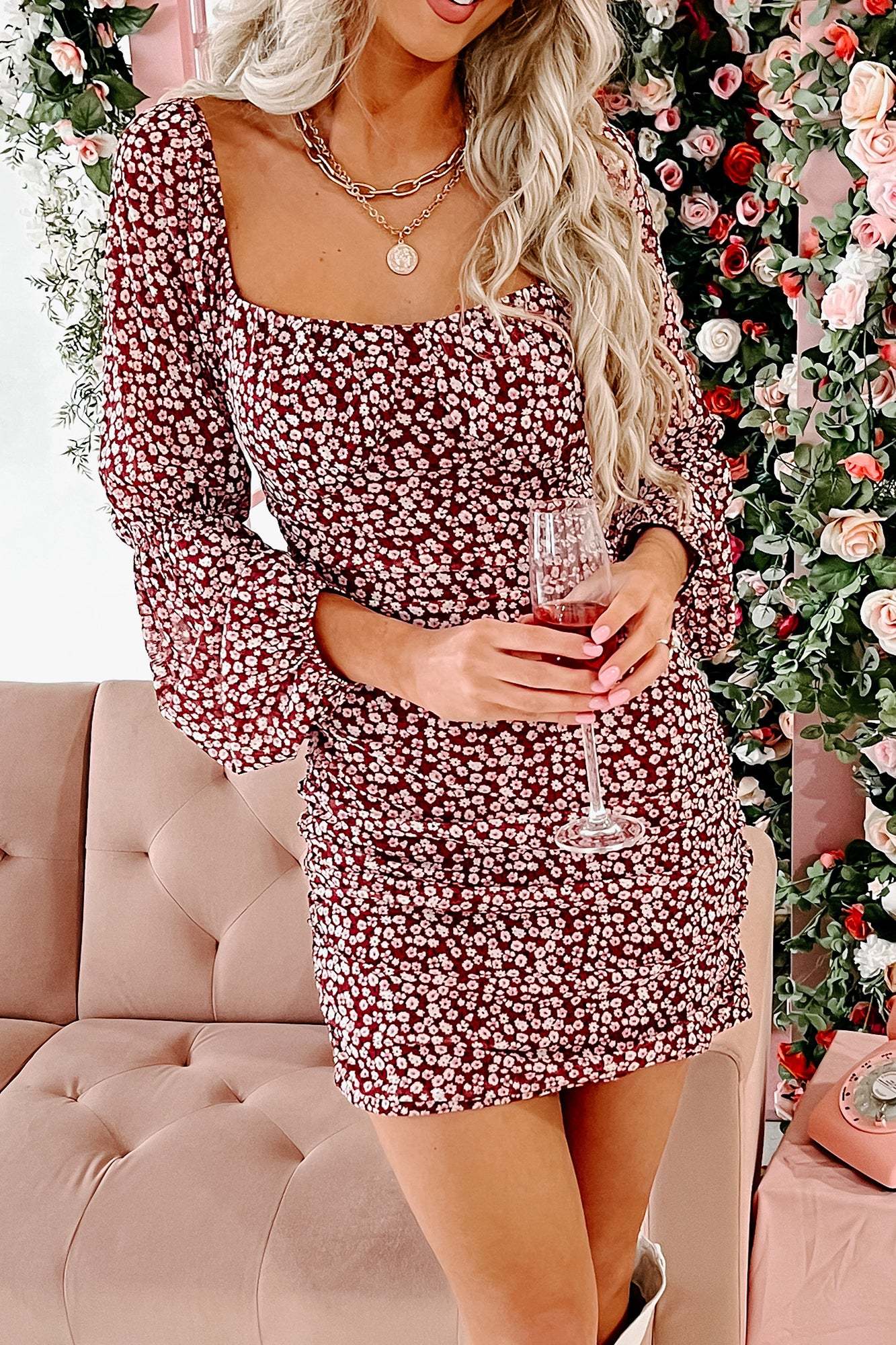 Pacey Ditsy Floral Ruched Mini Dress (Burgundy)