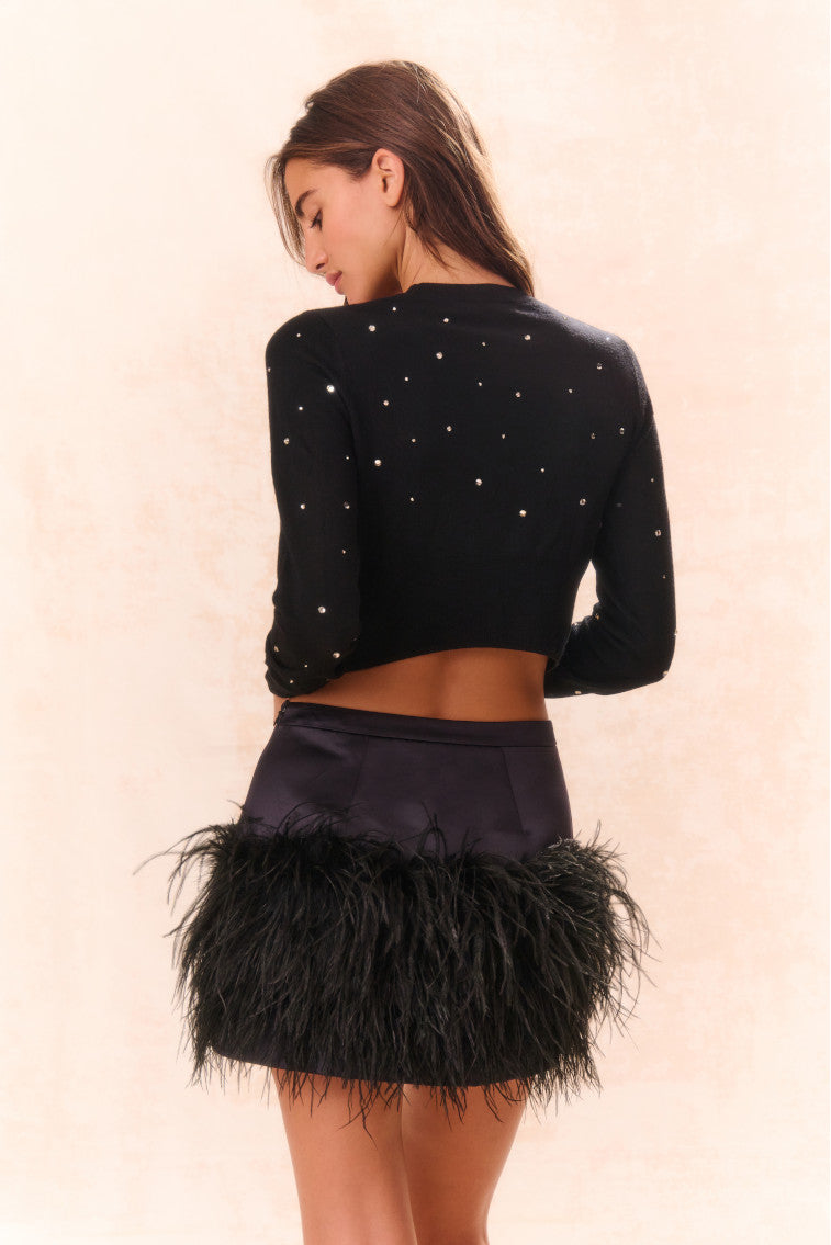 Easy and cozy the Pammie Pullover arrives. Designed from 100% merino wool. this warm. lightweight pullover debuts with a slim fit and a hand-sewn OhMollys bow reimagined with crystals placed at the chest. Tiny crystal details are sprinkled all over the sweater while a high rib detail is featured at the back.