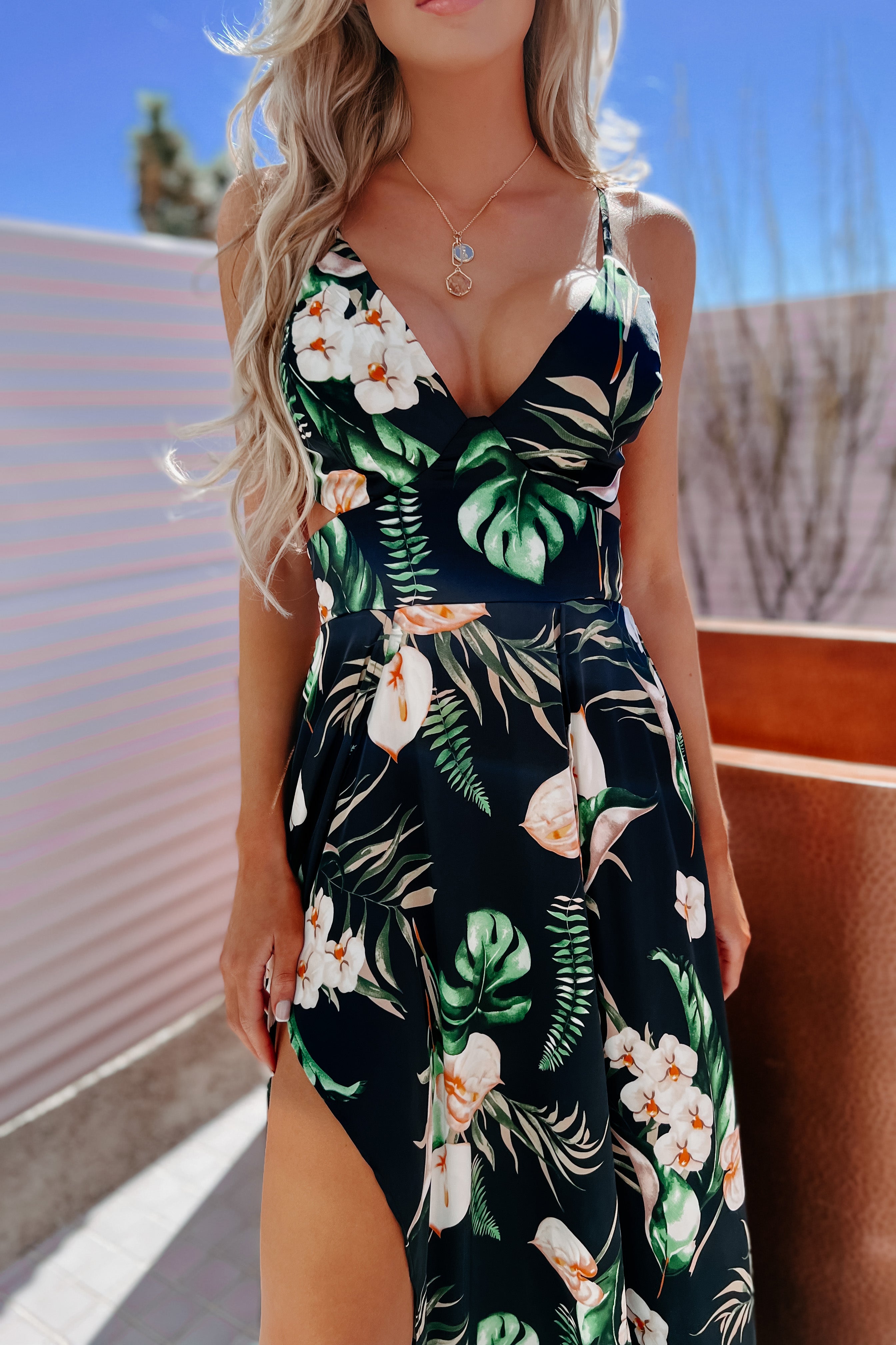 This Black. Tropical Printed Maxi Dress Has All The Best Features Like A Tie-Back Design & High Leg Slits That Will Make Your Legs Look A Mile Long!