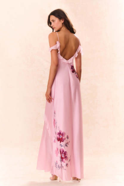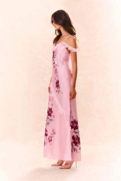 Put on the pretty with the Parisa Dress. Designed from drapey silk. this dress features an oversized bouquet flower print that beautifully traces the body and flows up the sides. creating a striking visual effect. The slim. body-skimming silhouette is complemented by delicate chiffon ruffles around the neckline and fluttery chiffon straps around the arms. Adjustable spaghetti straps provide a perfect fit. while the deep V open back. adorned with cascading ruffles. adds a touch of drama. Designed to make a statement. the Parisa Dress is perfect for any occasion or night out.