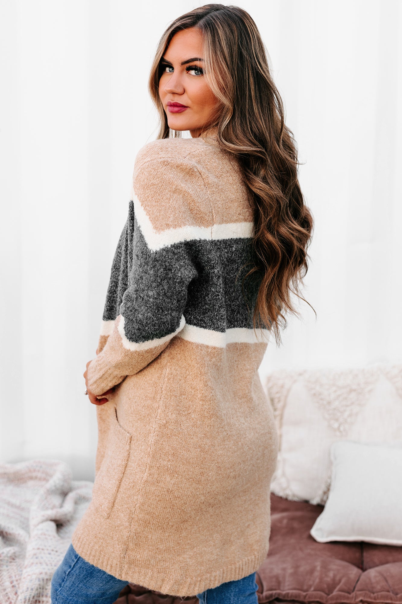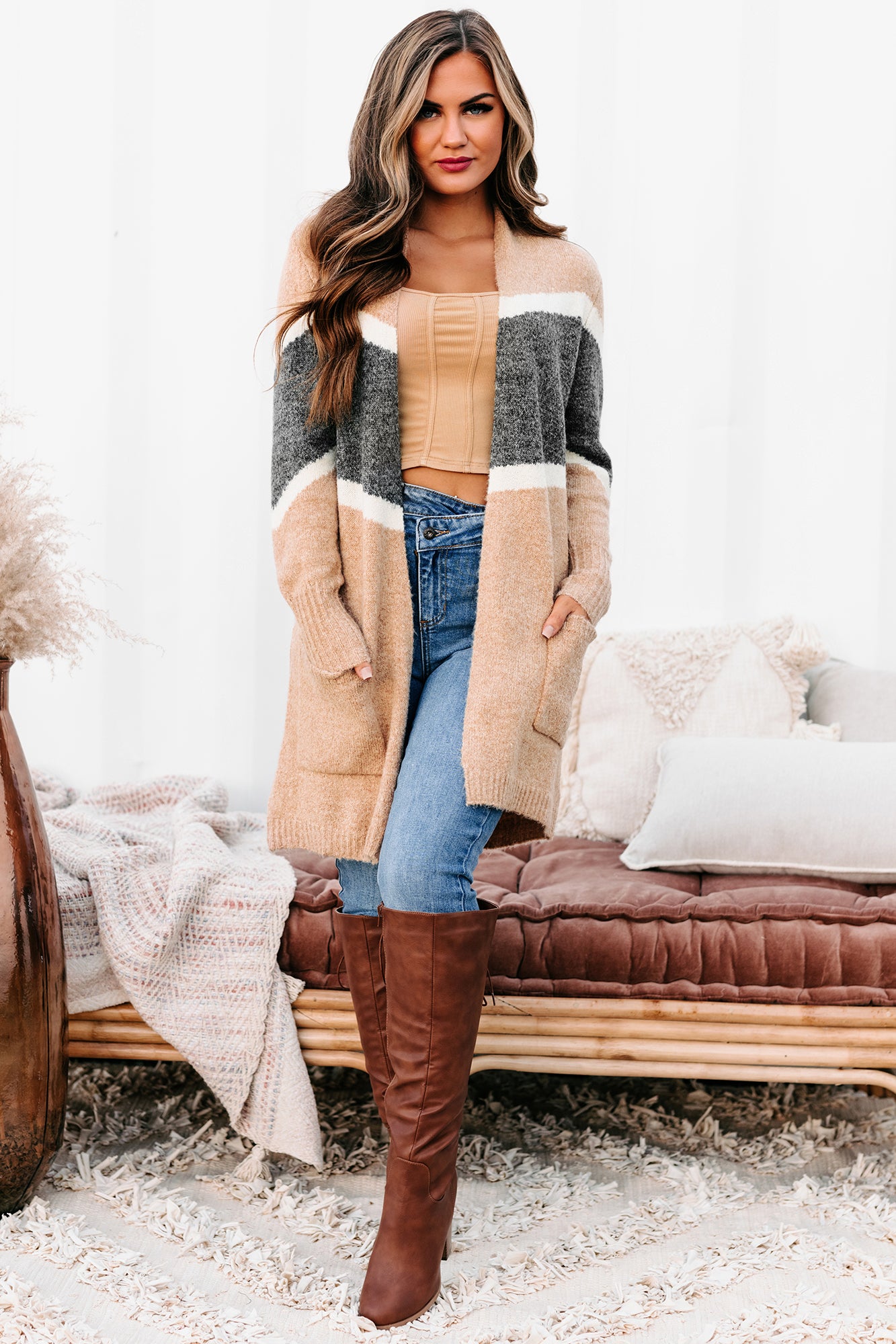 Finish Off Any Neutral Outfit With This Cute. Taupe. Striped. Open Front Cardigan!