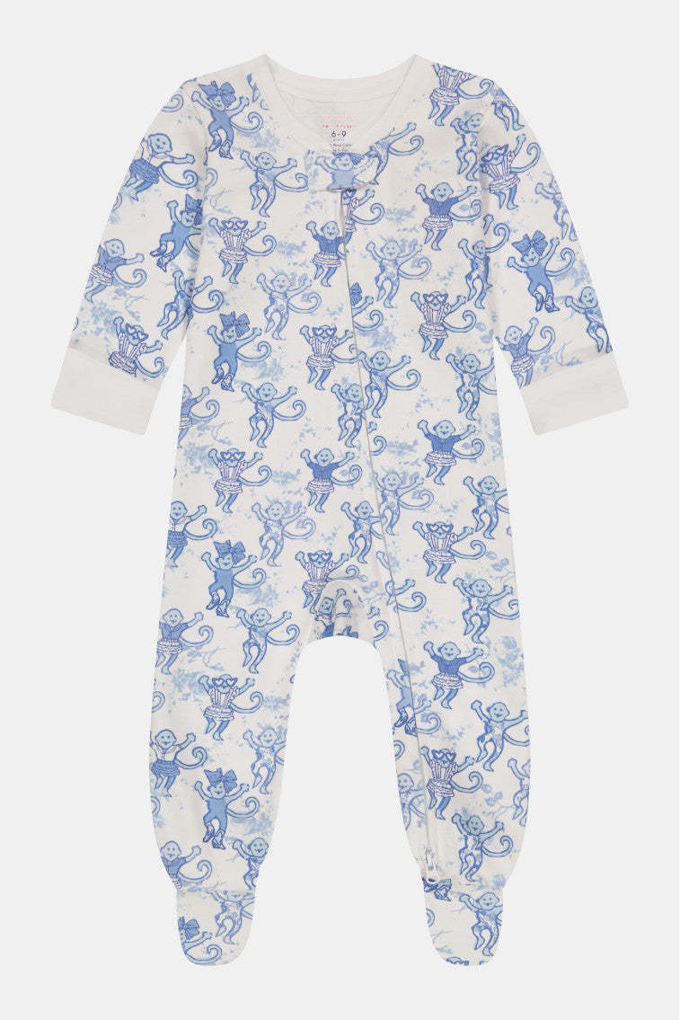 Wrap your baby up in love with these sweet footie PJs from our OhMollys x Roller Rabbit collab. These dreamy PJs feature a new limited-edition print: Pastiche De Monkey. which features our favorite sea breeze blue Pastiche De Bouquet print tied to Roller Rabbit's signature monkey motif. Made from a 100% cotton fabric. this footie is super soft and breathable for your baby and a two-way zipper makes getting ready for bed or the day super easy.