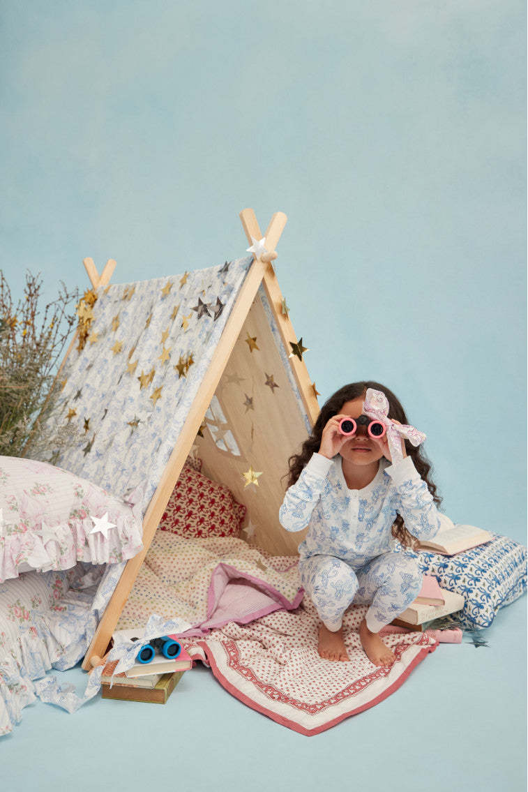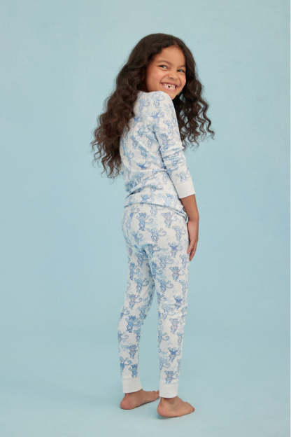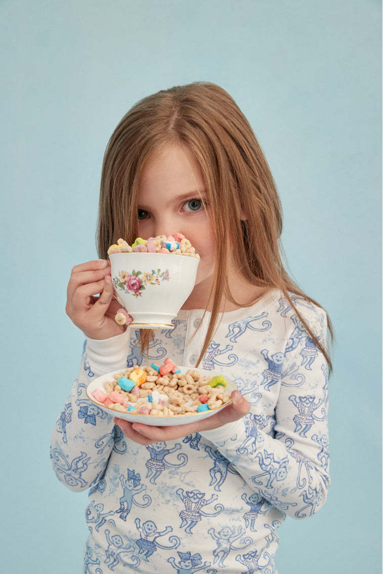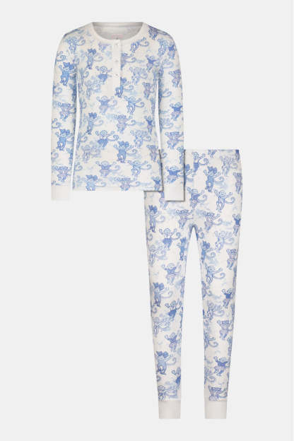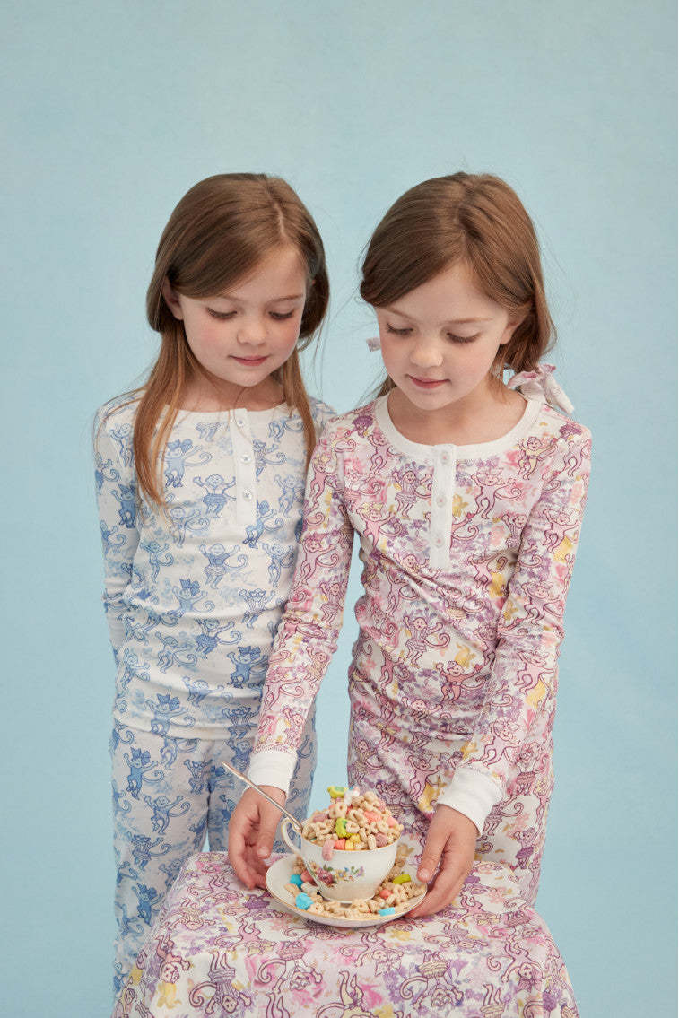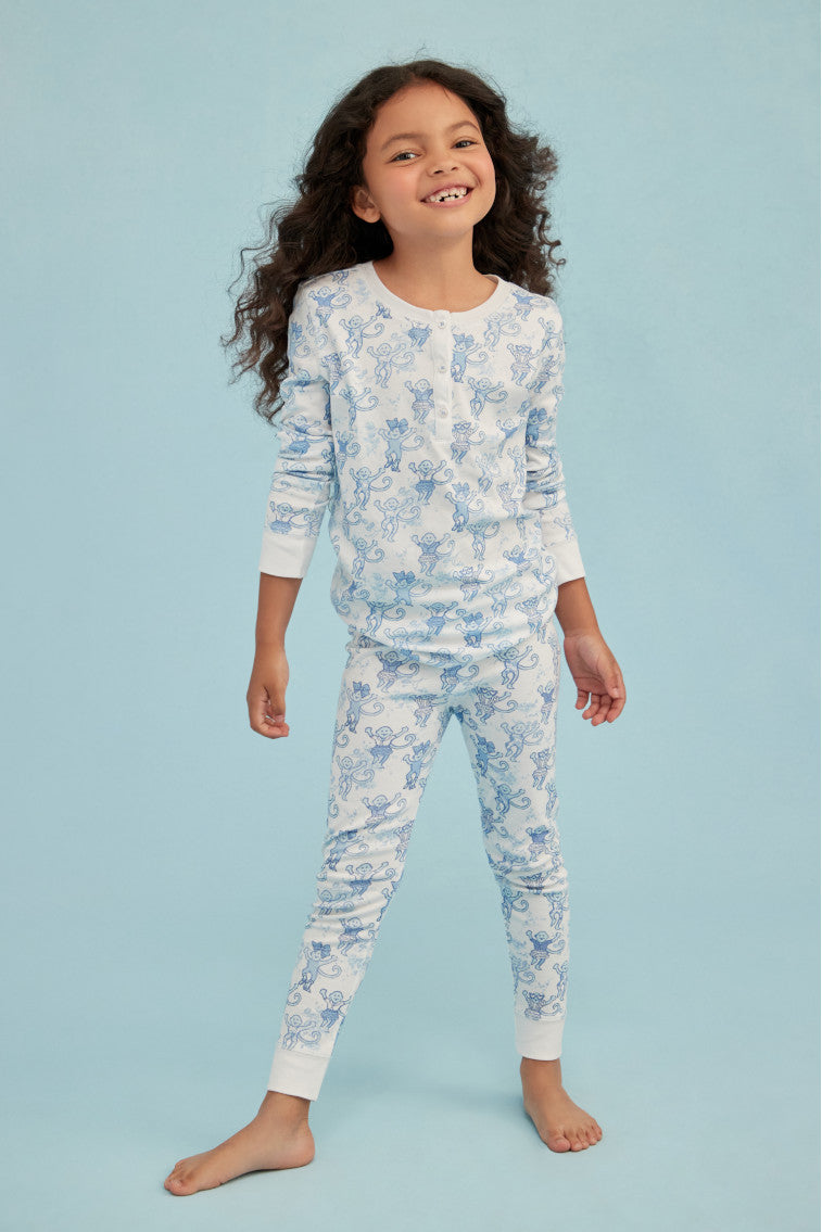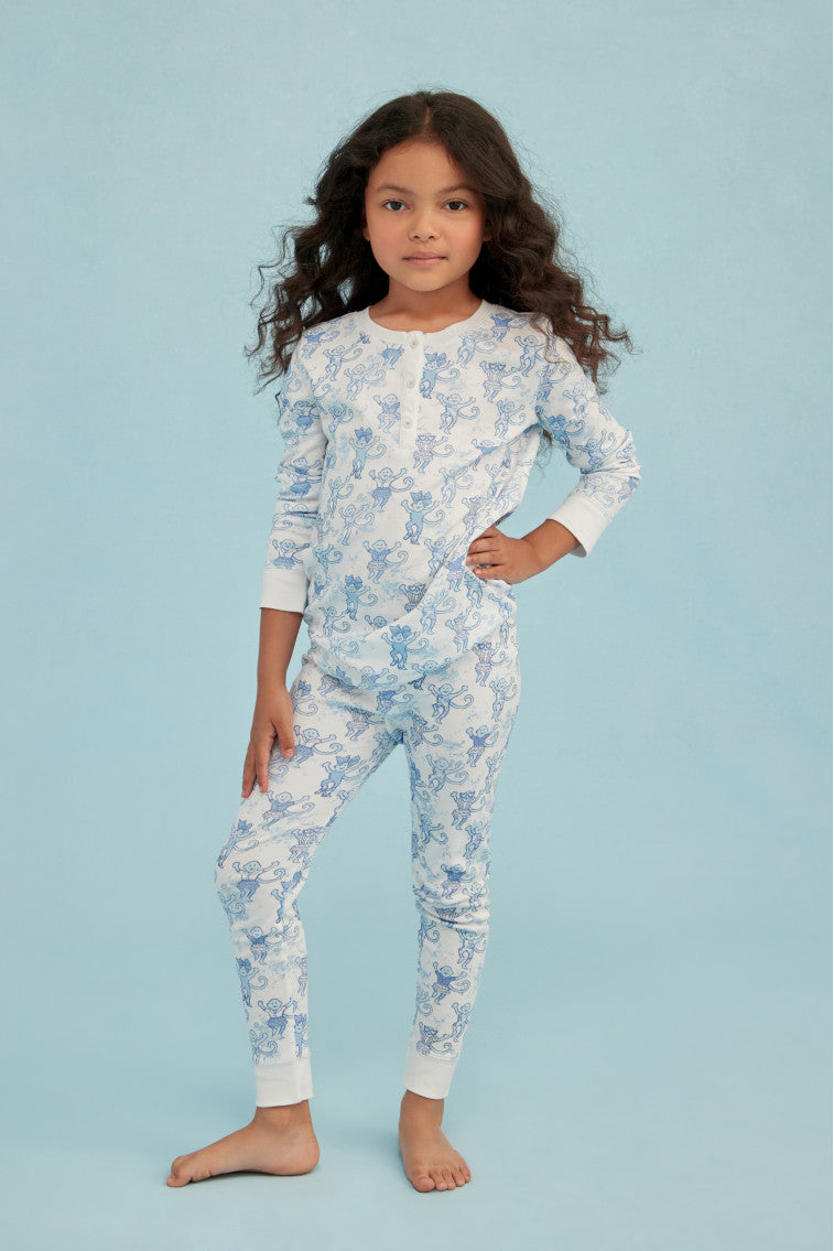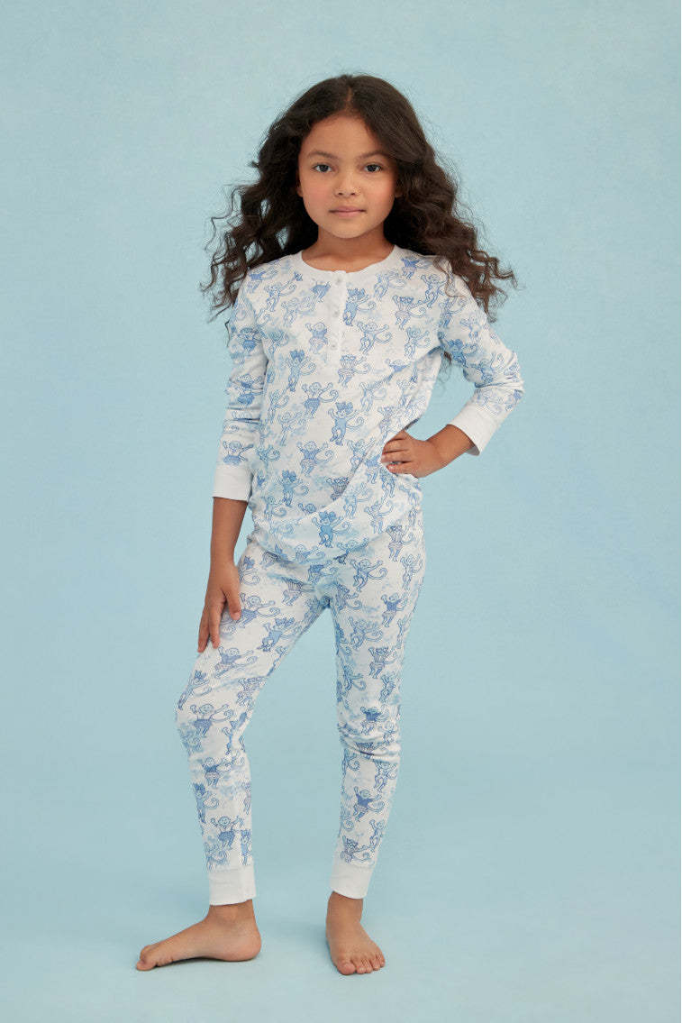 Keep your little one cute and comfortable with these pajamas from our OhMollys x Roller Rabbit collaboration. These dreamy PJs feature a new limited-edition print: Pastiche De Monkey. which features our favorite sea breeze blue Pastiche De Bouquet print tied to Roller Rabbit's signature monkey motif. Made from 100% cotton fabric. these pajamas are soft and easy to wear. making them a bedtime essential for our littles of all ages. The two-piece set includes a 3 button henley. elastic waist in the pants. and super-smooth flatlock seams.