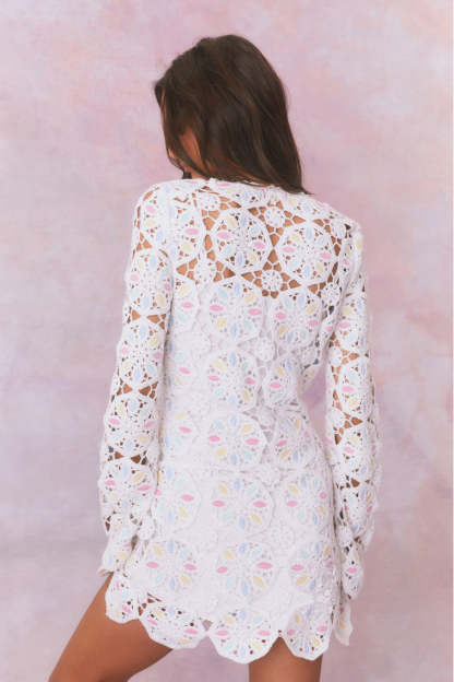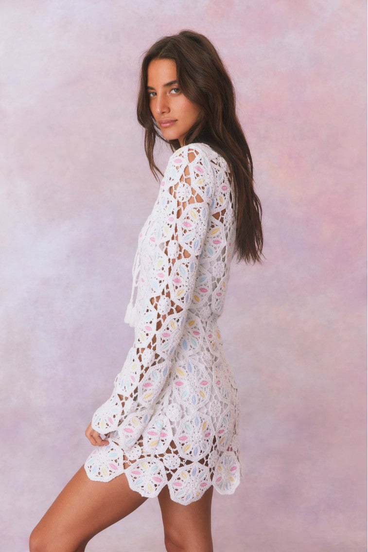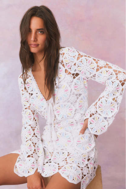 Boho chic in the Poemes Dress. This dreamy mini stuns with our gorgeous wheel-shaped crochet fabric featuring pastel colors mixed in all over ideal for warm weather days. The beachy dress has a body skimming silhouette. a deep v-neck. and drawcord tassels. The piece comes with a separate mini slip lining.