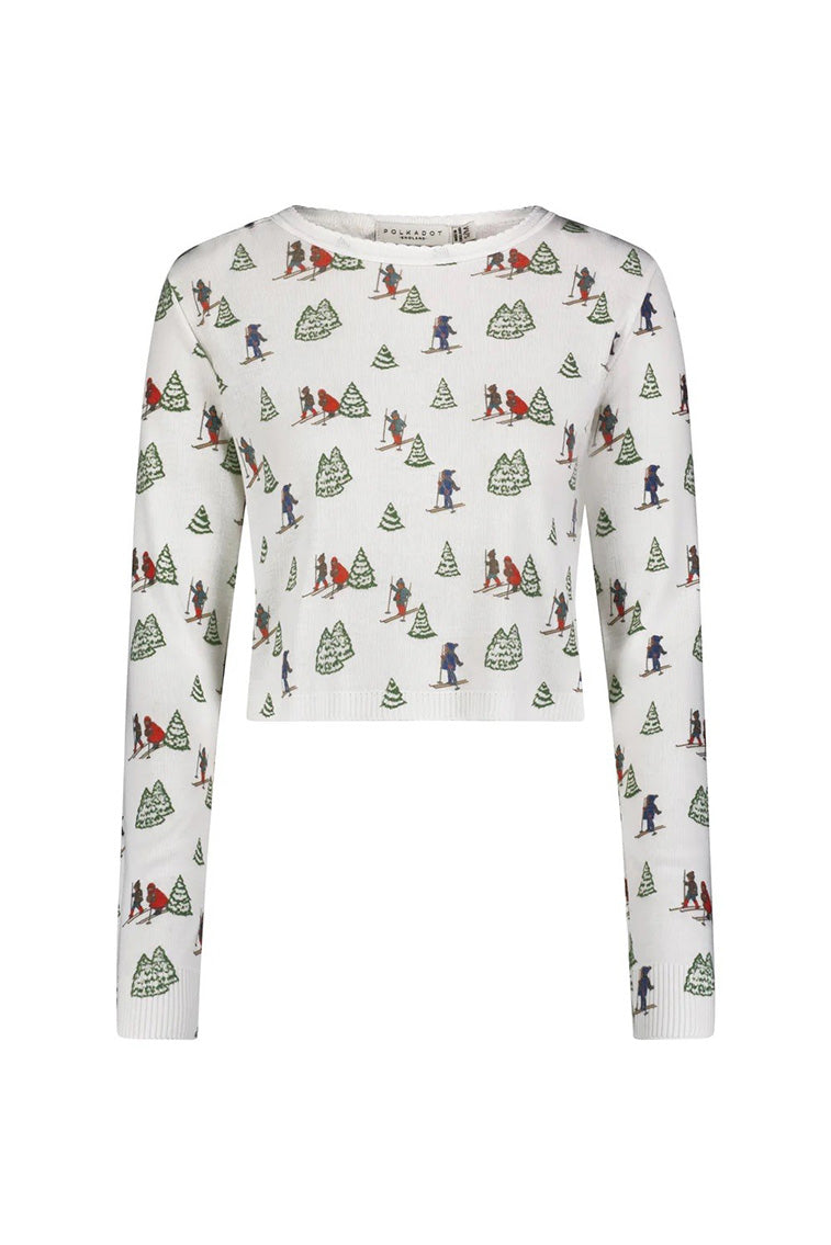 This crew neck long sleeve top with scallop neckline features a rib knit with natural stretch. The pre-washed British heritage knitting shows a custom ski print perfect for cozy winter nights.
