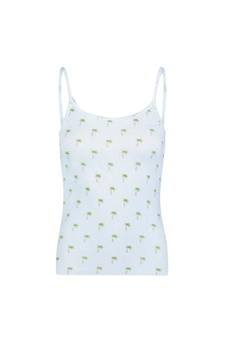 This crew neck long sleeve top with scallop neckline features a rib knit with natural stretch. The pre-washed British heritage knitting shows a palm tree print.