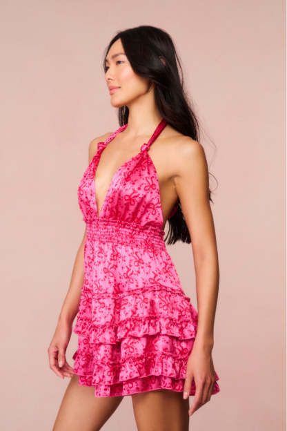 The Quintelle Dress returns with a spirited winding bow print all over. A revamped version of our best-selling Deanna Dress. the flirty Quintelle is a Victorian-inspired mini perfect for your next party. With an elasticated waist. this dress is easy to pull on and wear. The playful skirt features textured micro pleats and tiny ruffles all over.