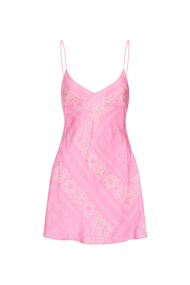 Effortlessly cool in the Raja Dress. Designed from a silk habotai fabric. this lightweight. playful mini features a diagonal. bandana-inspired artwork all over with feminine bow details. The dress begins with thin spaghetti straps above a slight v-neckline that descends to a slightly airy skirt.