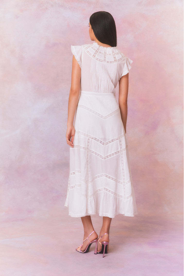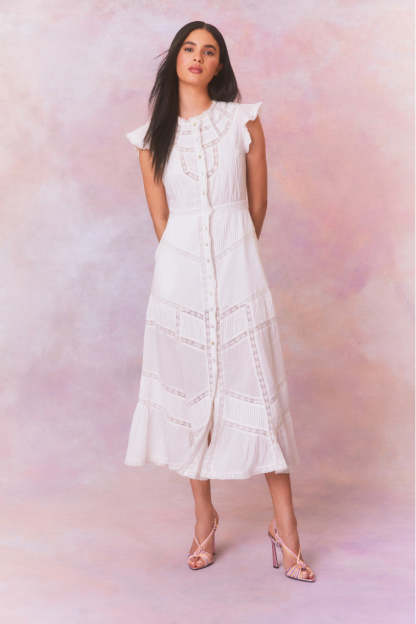 A new classic. the Remi Dress makes its debut. This Victorian-inspired midi dress is designed from an organic cotton fabric and features a beautiful medley of vintage-inspired. chevron laces all over. The piece begins with a high neck and short flutter sleeves that falls to a center front placket with buttons that run down the entire dress before releasing into a flouncy. airy skirt.