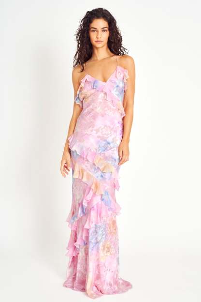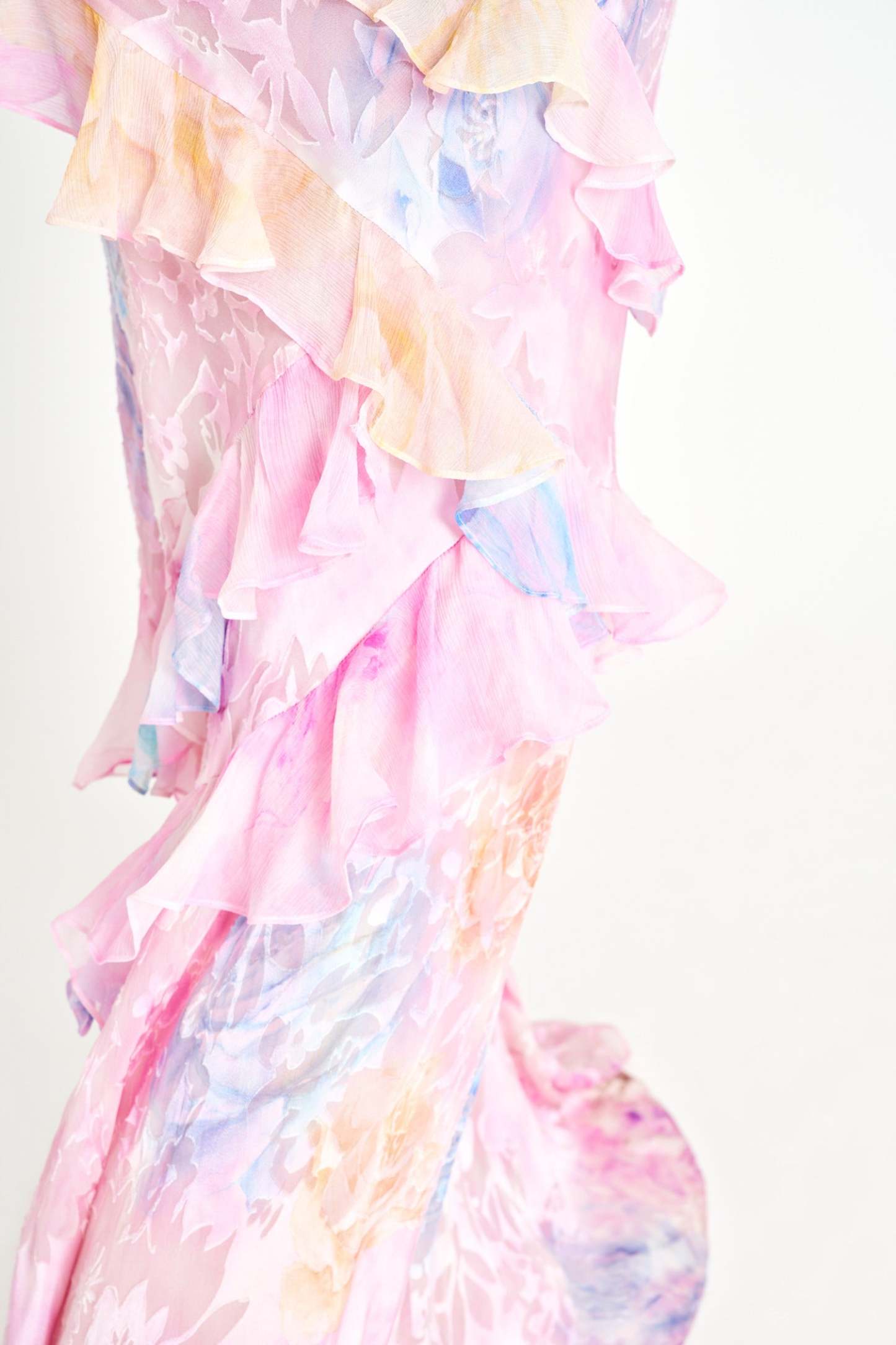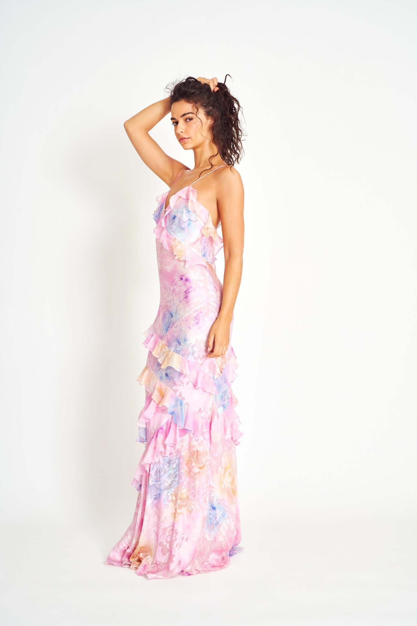 The dress everyone's obsessed with is back in its debut prints. Designed completely with crinkle burnout chiffon fabric. this must-have maxi stuns with a vibrant floral design and overlapping. asymmetrical ruffles at the neckline that continue to descend through the entire skirt. Slightly fitted. this dress features a Glamorous silhouette and includes a side seam zipper for closure.