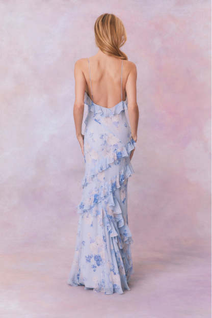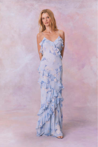 Designed for dancing. our Rialto Dress returns to match our fragrances in their dreamy prints. This must-have maxi stuns with a chiffon fabric and overlapping. asymmetrical ruffles at the neckline that continue to descend through the entire skirt. Slightly fitted. this dress features a Glamorous silhouette and includes a side seam zipper for closure.
