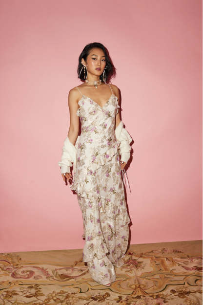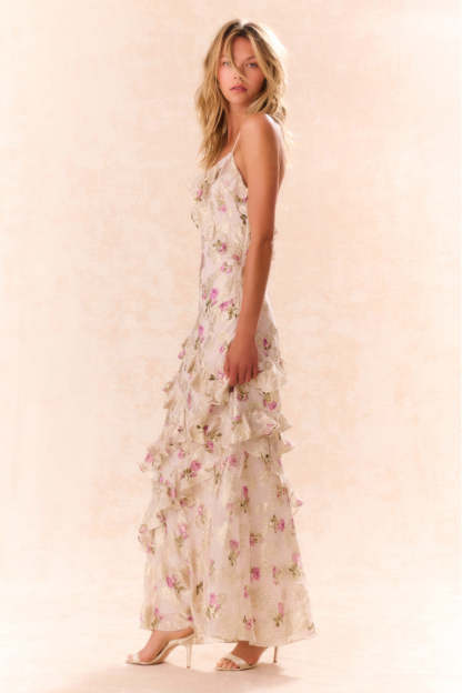 Everyone's favorite Rialto Dress returns. Designed with a 100% silk charmeuse fabric. the dress features vibrant florals throughout contrasted with metallic gold prints all over. This must-have maxi stuns with overlapping. asymmetrical ruffles at the neckline that continue to descend through the entire skirt. Slightly fitted. this dress features a Glamorous silhouette and includes a side seam zipper for closure.
