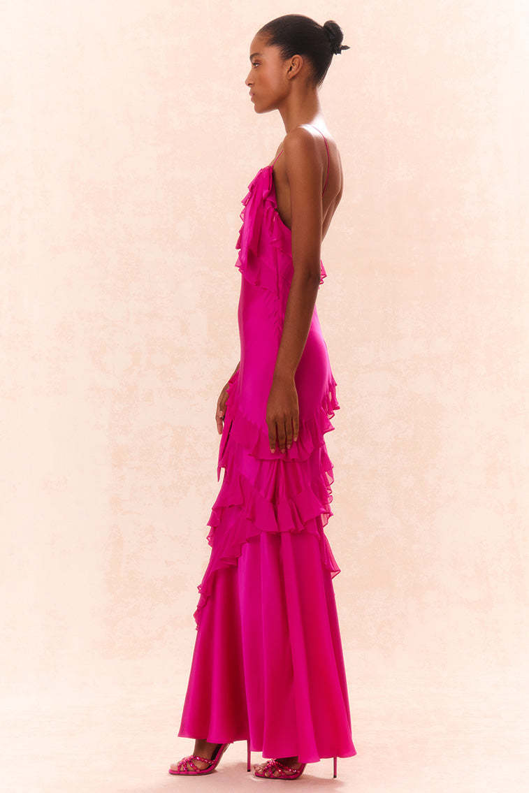 Our best-selling Rialto Dress returns. Designed with a silk charmeuse fabric. the dress features bows placed throughout for an added touch of love. This must-have maxi stuns with overlapping. asymmetrical ruffles at the neckline that continue to descend through the entire skirt. Slightly fitted. this dress features a Glamorous silhouette and includes a side seam zipper for closure.