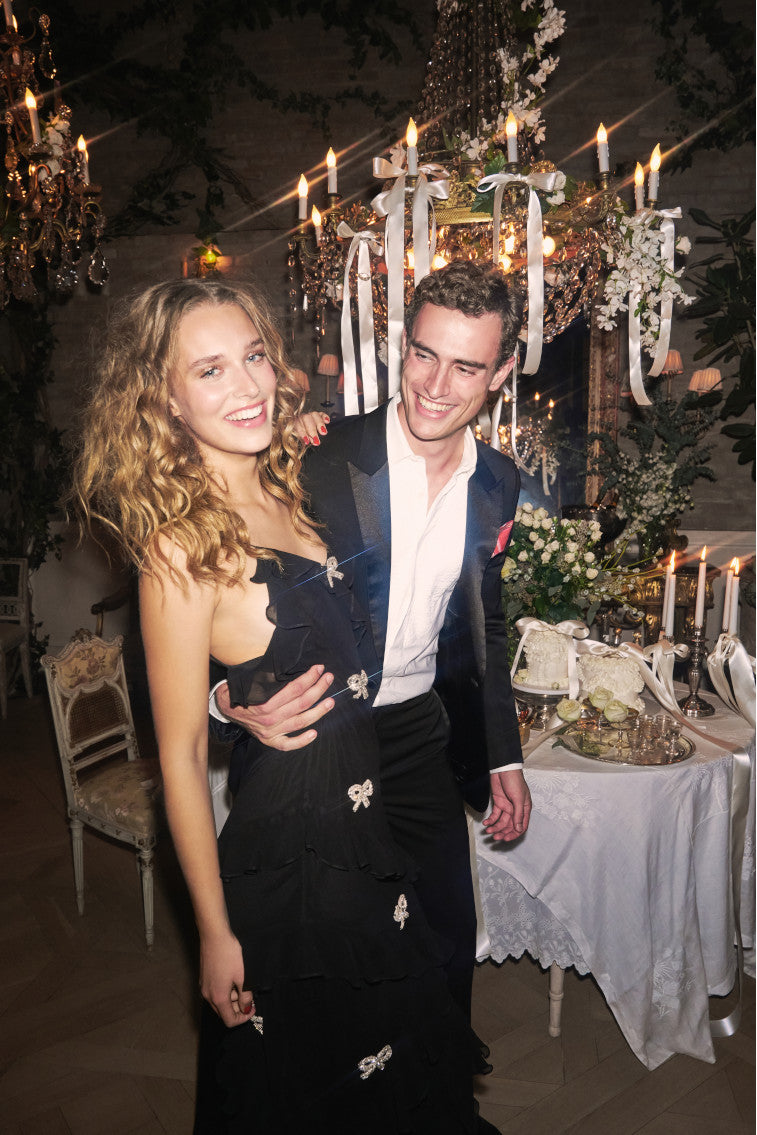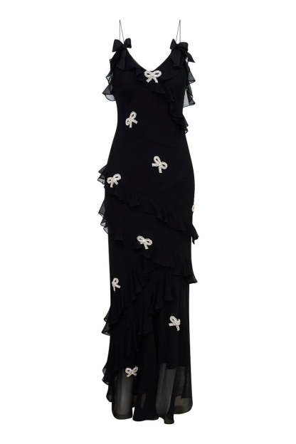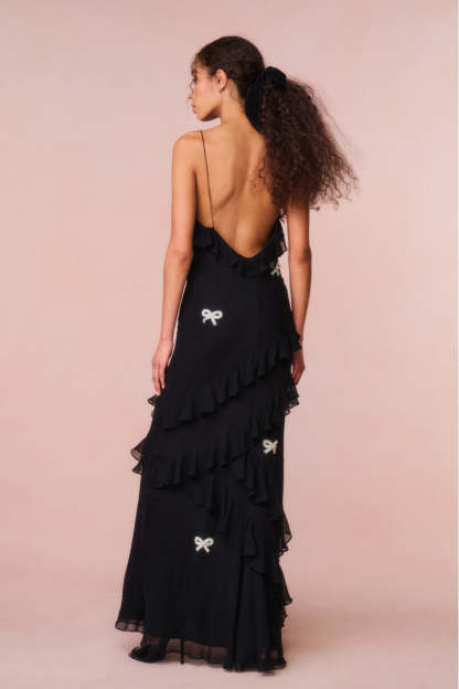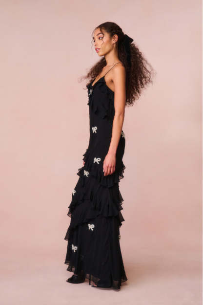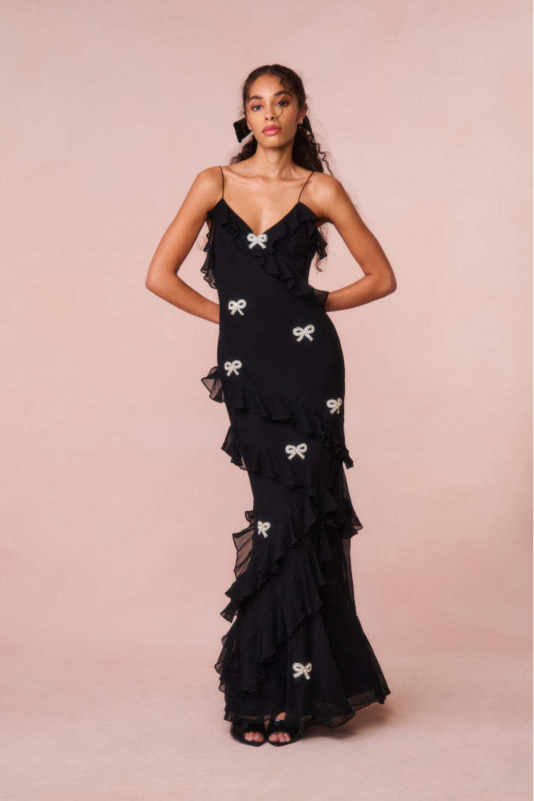 Everyone's favorite Rialto Dress is back and she's flirtier than ever. Arriving in a black chiffon fabric. this elevated party maxi shimmers with crystal-studded bows embroidered all over. Our best-selling dress stuns with overlapping. asymmetrical ruffles at the neckline that continue to descend through the entire skirt. Slightly fitted. this dress features a Glamorous silhouette and includes a side seam zipper for closure.