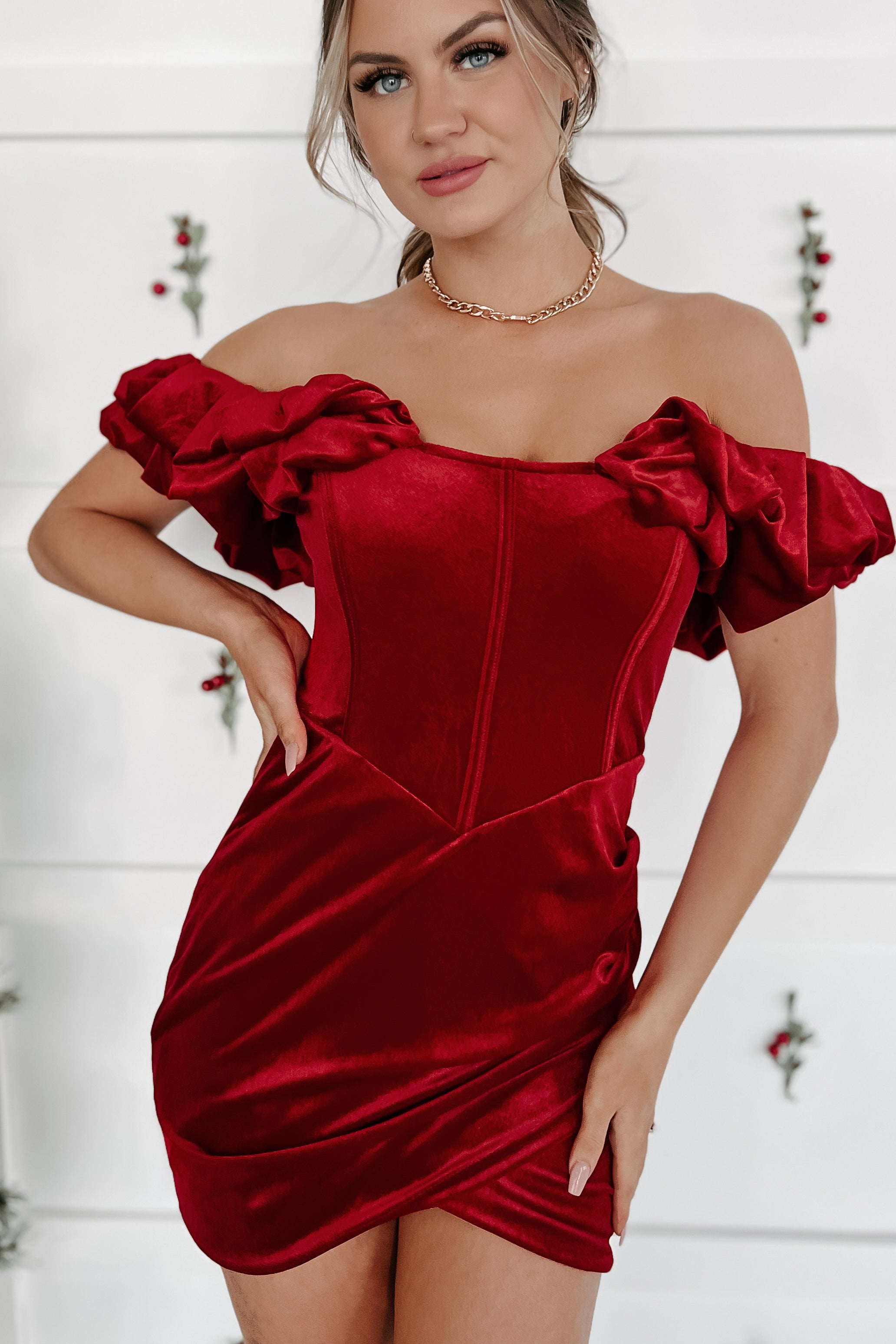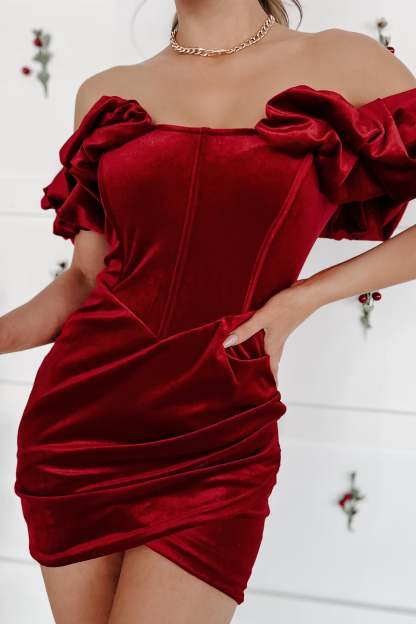 Right On Cue Off The Shoulder Velvet Mini Dress (Red)
