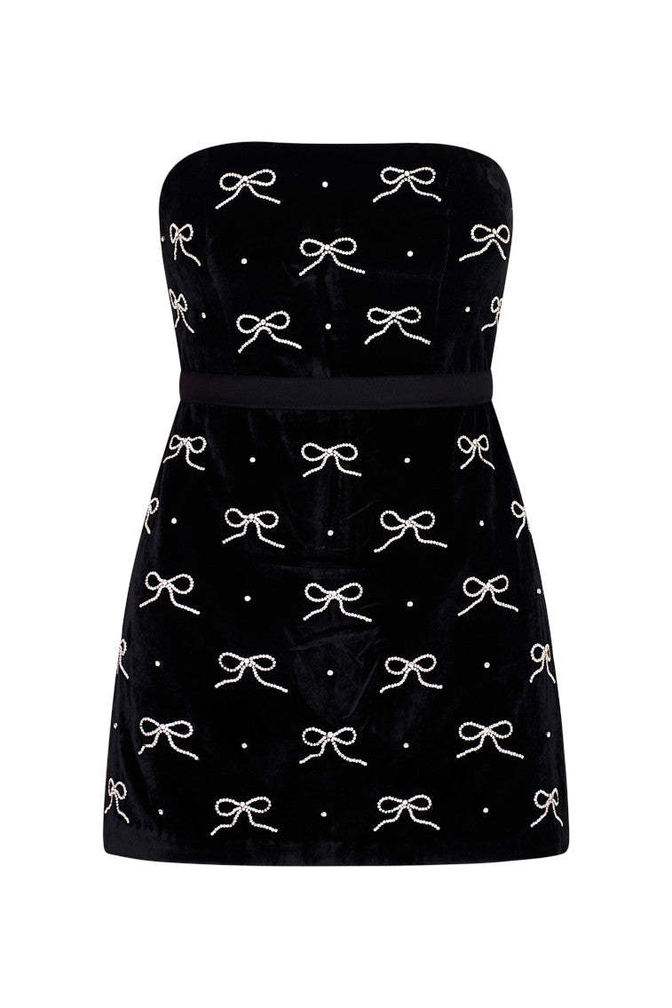 Party perfection in the Rinwell Dress. This elevated evening piece is designed from a drapey. velvet fabric embellished with delicate hand-applied pearl bow appliqués and tiny individual pearls all over. A flirty mod dress. the strapless mini is easy-to-wear and cinches at the waist for a flattering and feminine fit.