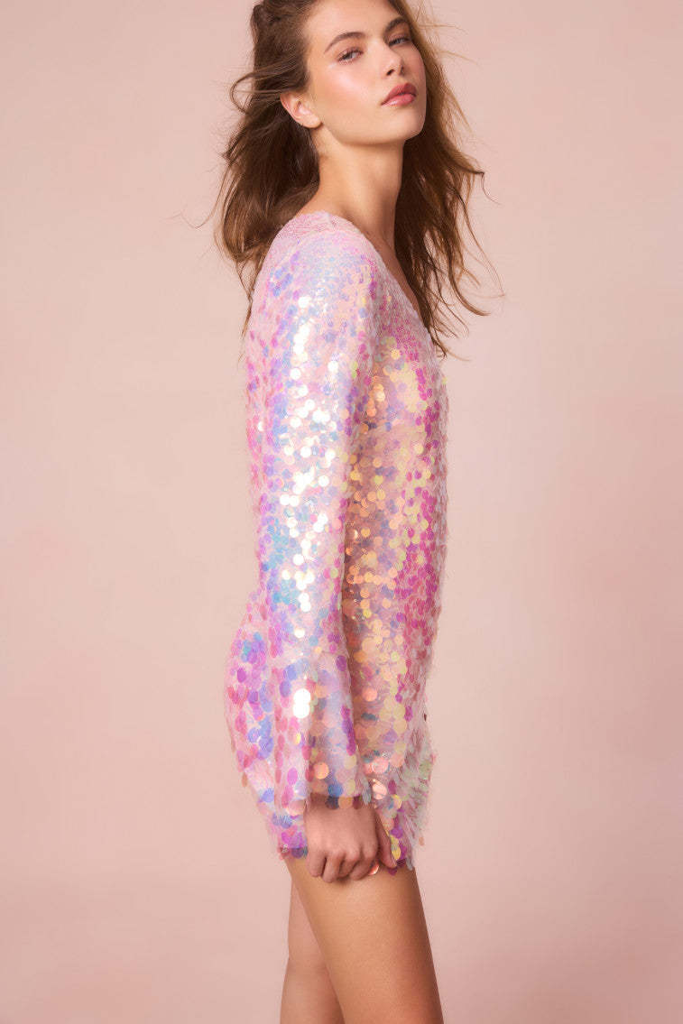 Disco dream comes true in the Risbo Dress. This mermaid-inspired party dress debuts with iridescent. light-catching paillettes that gradually go from smaller to larger as the flow down the mini dress. A body-skimming silhouette gives this piece a flattering fit. Designed for dancing. this stunning piece is ideal for your next holiday party or New Year's Eve.