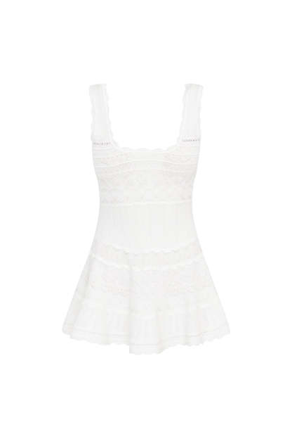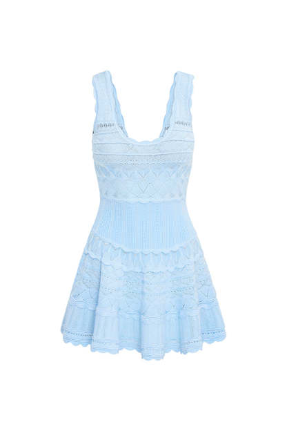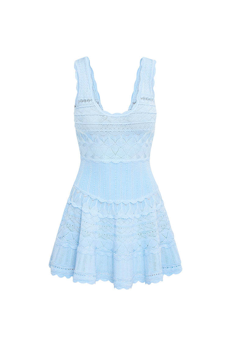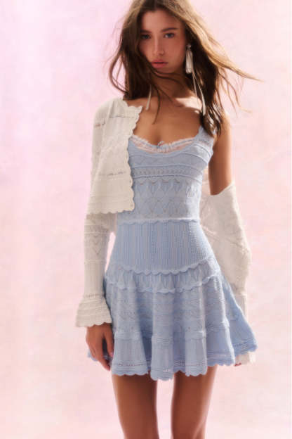 Living in the Ronelle Dress. This timeless mini is designed from a lightweight. soft pointelle fabric and features scallop detail through the stitch and edge. With a little bit of stretch the dress is easy and comfortable to wear. There's cinching at the waist before falling to a full skirt with a scallop trim.
