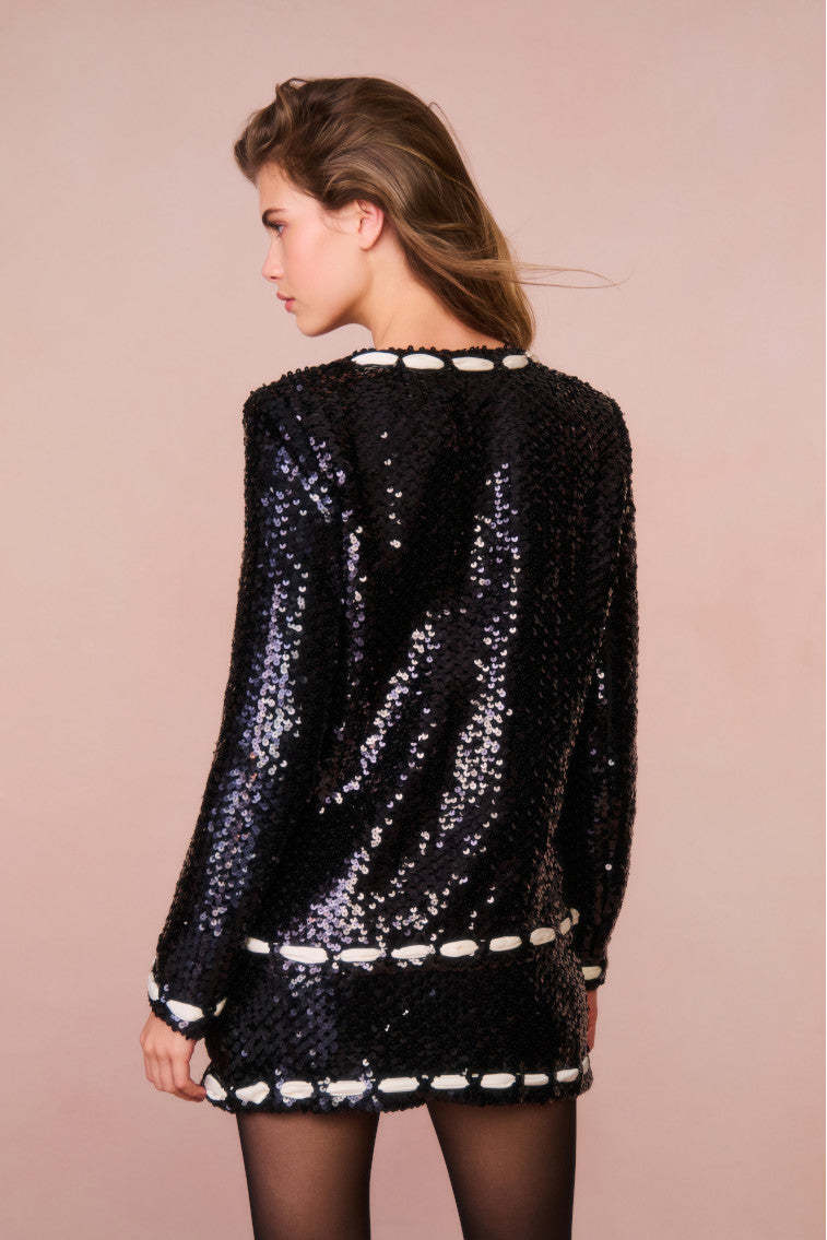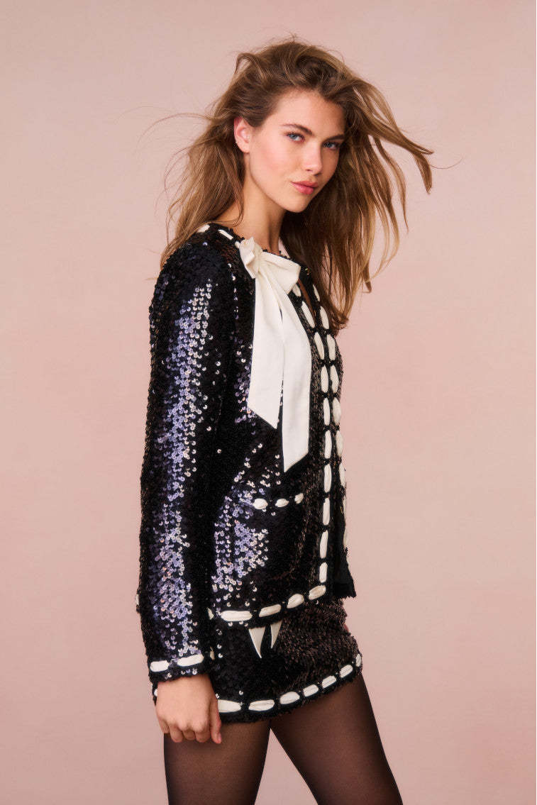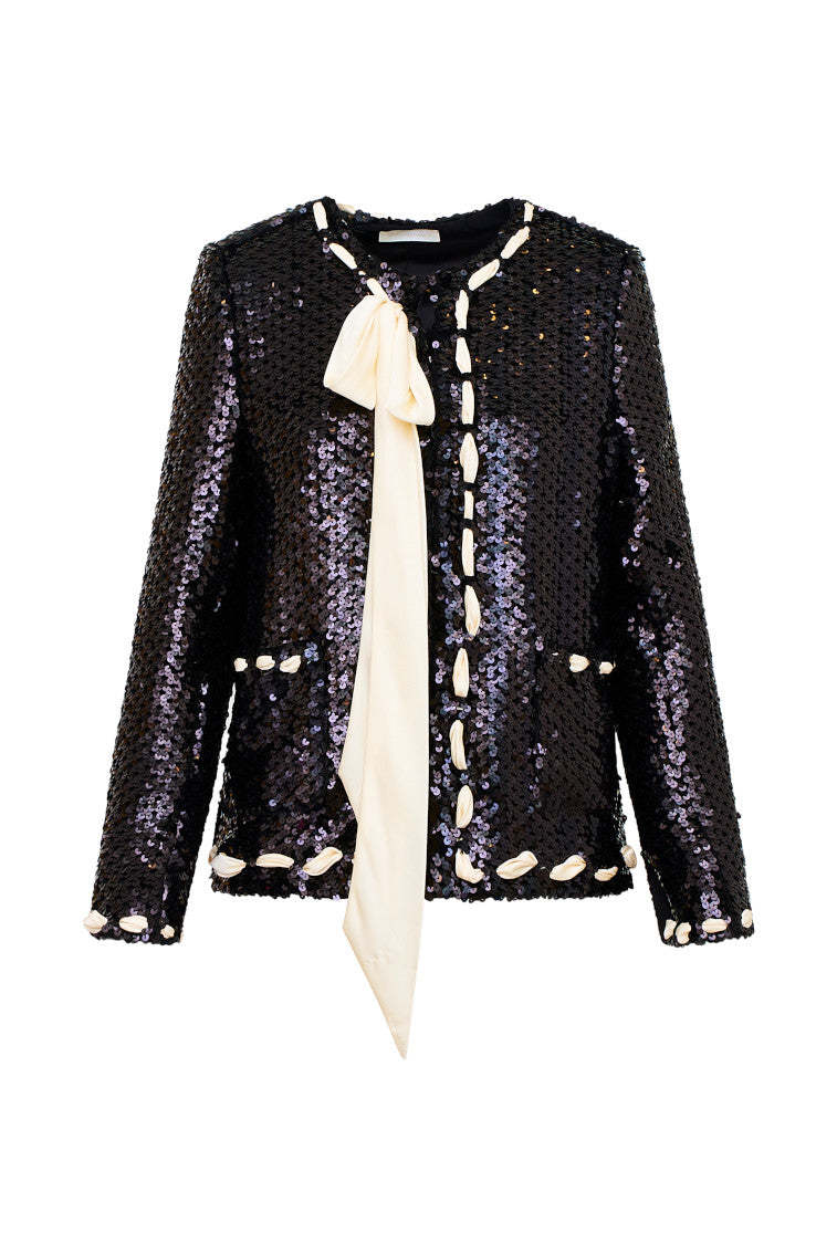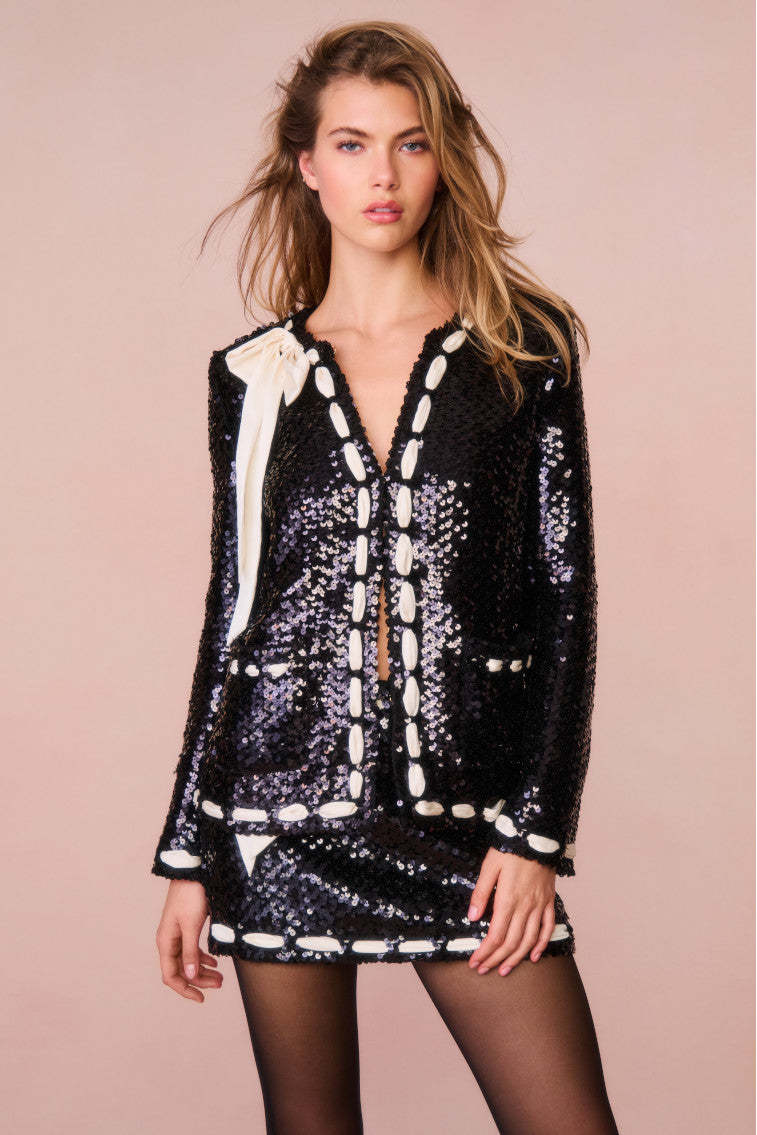 Look chic in the Rosina Jacket. This elevated piece debuts with shimmering black sequins all over and contrasting cream charmeuse sashes woven throughout that self tie into a bow around the jacket. With an oversized fit. the jacket features a straight yet generous silhouette. long sleeves. and pockets at the hips. This piece comes fully lined. Pair it with the Lovina Skirt for a full set.