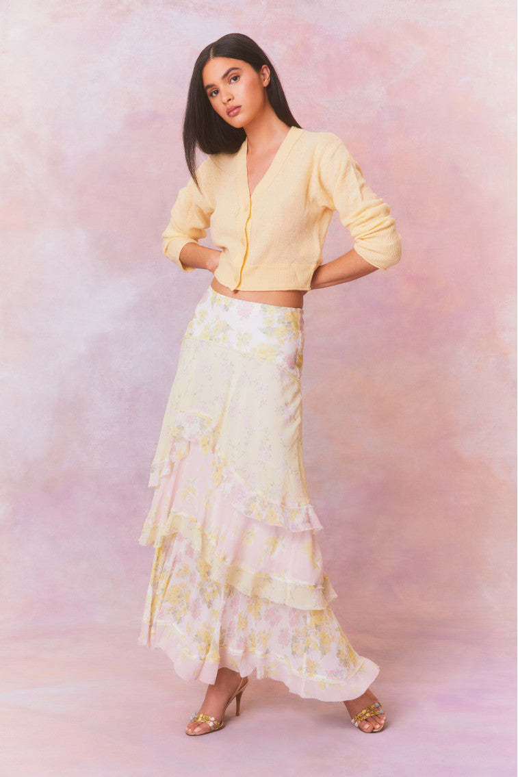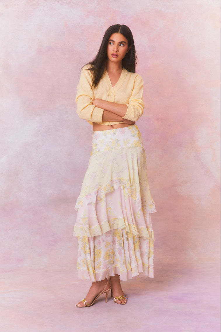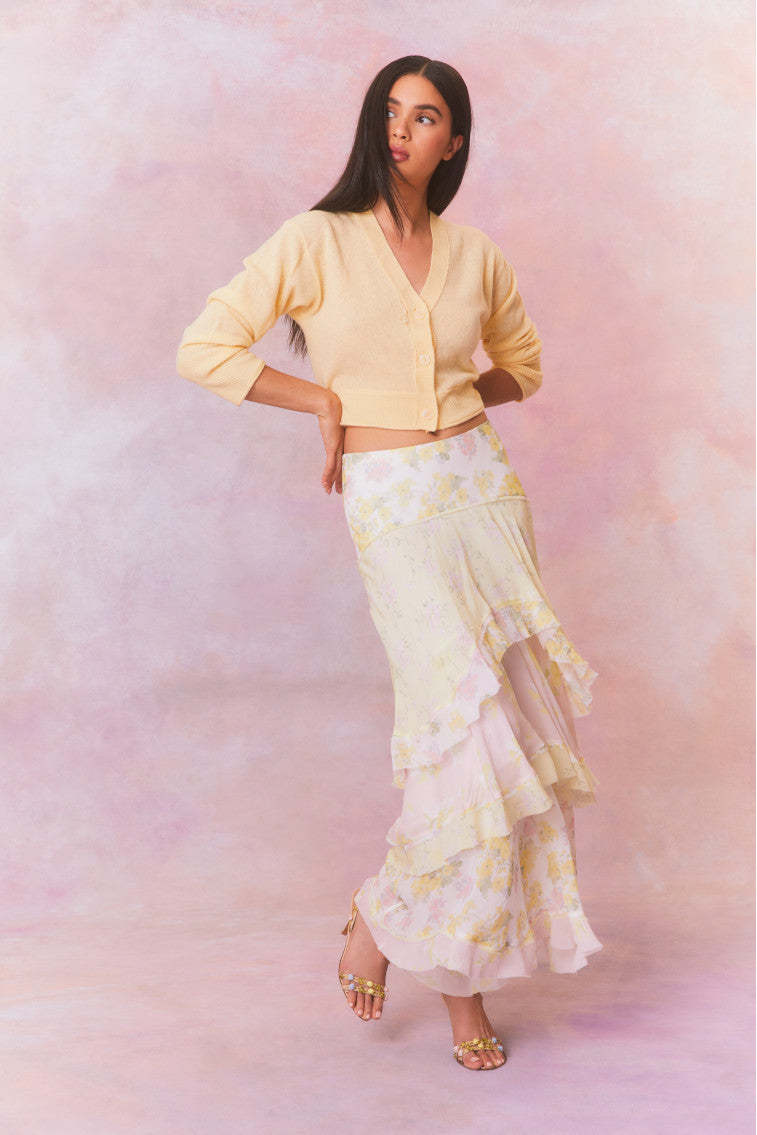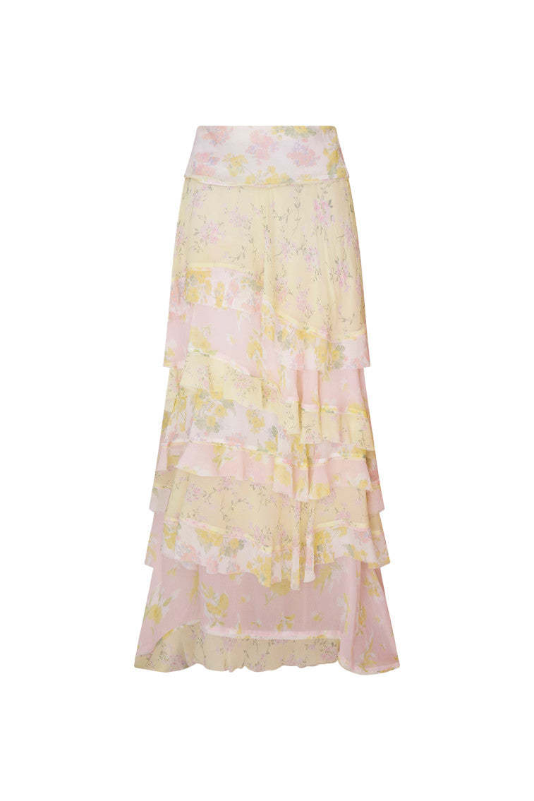 Romance found in the Ruella Skirt. This ethereal maxi stuns with a chiffon fabric featuring a feminine mixed print all over and a delicate bias strip for added depth. The high-to-low maxi skirt features a blend of asymmetrical ruffles all over.